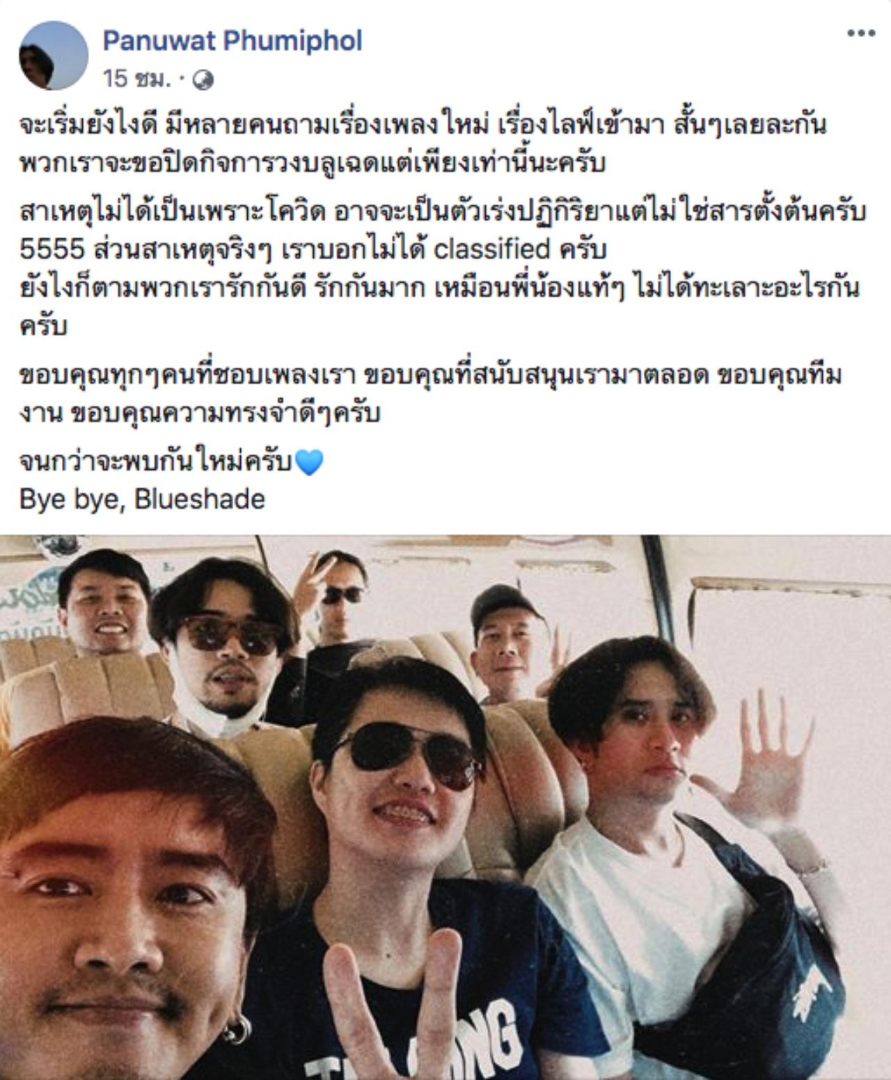 "จะเริ่มยังไงดี มีหลายคนถามเรื่องเพลงใหม่ เรื่องไลฟ์เข้ามา สั้นๆ เลยละกัน พวกเราจะขอปิดกิจการวงบลูเฉดแต่เพียงเท่านี้นะครับ สาเหตุไม่ได้เป็นเพราะโควิด อาจจะเป็นตัวเร่งปฏิกิริยาแต่ไม่ใช่สารตั้งต้นครับ 5555 ส่วนสาเหตุจริงๆ เราบอกไม่ได้ classified ครับ