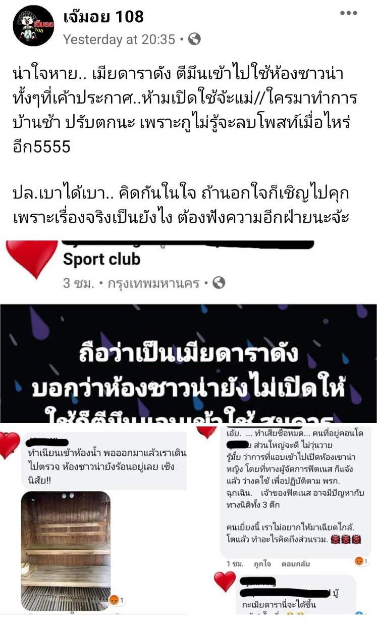 ซึ่งภาพข้อความของผู้ใช้เฟซบุ๊กคนหนึ่งที่ เจ๊มอย 108 โพสต์ เขียนไว้ว่า “ถือว่าเป็นเมียดาราดัง บอกว่าห้องซาวน่ายังไม่เปิดให้ใช้ ก็ตีมึนแอบเข้าใช้ สมควรแล้วที่คนด่าเธอทั้งประเทศ (โพสต์แก้โมโหก่อน เดี๋ยวมาลบ)”, “ทำเนียนเข้าห้องน้ำ พอออกมาแล้วเราเดินไปตรวจ ห้องซาวน่ายังร้อนอยู่เลย เซ็ง นิสัย!!”