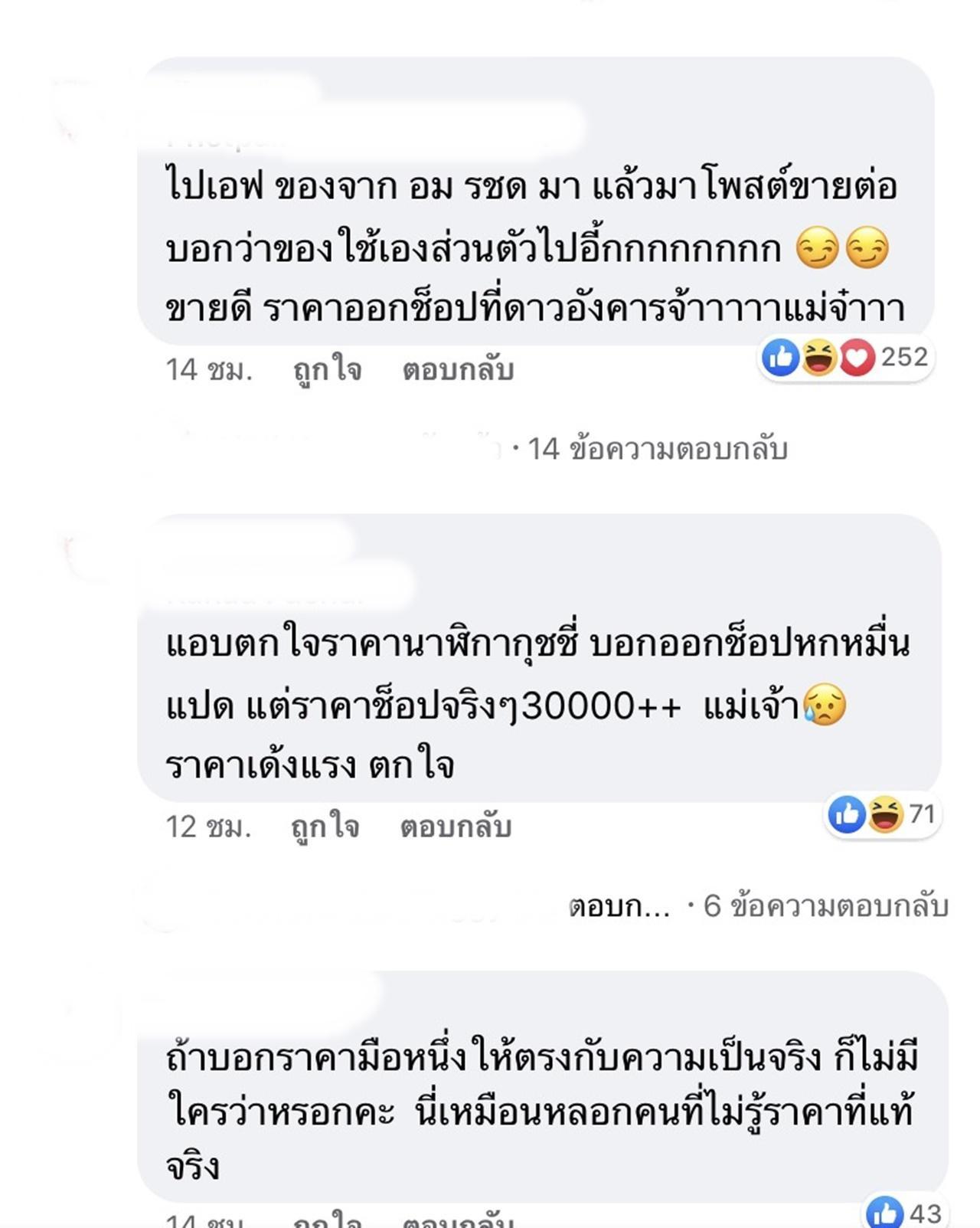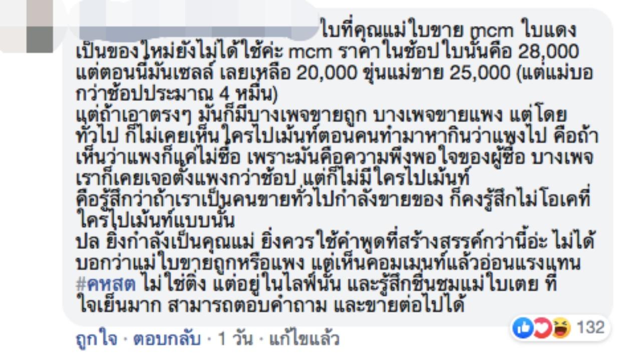 - ขณะที่บางคนแสดงความคิดเห็นว่า ใบเตย ไม่ควรใช้ความเป็นดาราที่แฟนๆ เชื่อใจว่าต้องขายของมีคุณภาพมาหลอกขายของในราคาสูงเกินจริง สงสารแฟนคลับที่อยากมีแบรนด์เนมแต่ไม่รู้ข้อมูล ต้องถูกหลอกขาย แต่ก็มีคนแย้งว่าเรื่องการซื้อขายของเป็นเรื่องความพึงพอใจของคนซื้อและคนขาย ที่ใคร่จะซื้อขายของกันในราคาที่ตกลงกัน