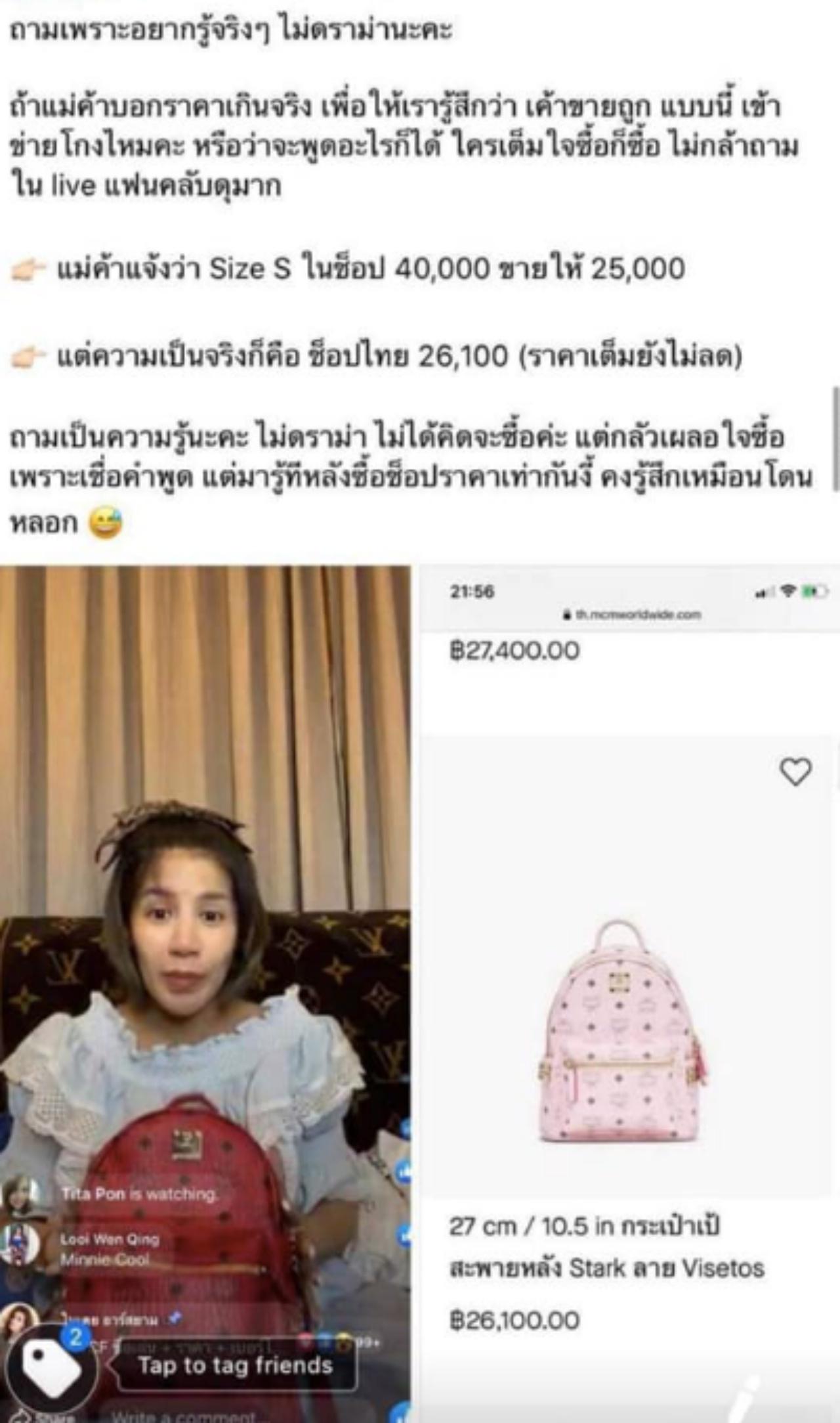 - เป้แบรนด์ดังเกาหลี MCM ราคามือ 1 ในช็อปดิวตี้ฟรีราคา 24,000 บาท มือ 2 ของใบเตย ขายราคา 25,000 บาท บางรายตั้งข้อสงสัยว่า ใบเตย แจ้งว่าในช็อปขาย 40,000 บาท แต่เธอนำมาขาย 25,000 บาท ทั้งที่จริงในช็อปไทยราคา 26,100 บาท