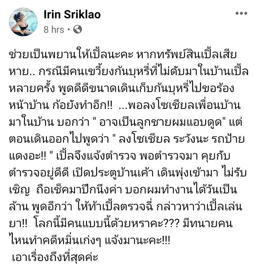 ก่อนจะโพสต์คลิปตอนที่เพื่อนบ้านคนดังกล่าวบุกเข้ามาในบ้าน และเขียนข้อความว่า “ขอนำมาลง เพราะต้องการสร้างหลักฐานเพื่อป้องกันตัวและแสดงความบริสุทธิ์ใจนะคะ กรณีมีคนเขวี้ยงก้นบุหรี่ที่มีไฟเข้ามาในบ้าน แจ้งเหตุกับตำรวจอยู่ดีดี เปิดประตูบ้านเค้า เดินพุ่งเข้ามา ไม่รับเชิญ แจ้งบุกรุกได้นะคะ มาถึงพูดผมเป็นเจ้าของบริษัท ผมหาเงินได้วันเป็นล้าน เอาเช็คมาโชว์ตำรวจ.. (มีคนบอกว่า ให้แจ้งนิติ นิติที่นี่แย่ค่ะ … มีคนบุกดักหน้าบ้าน รปภ เงียบไม่แจ้งเรา ให้ตกใจเอง พอถามตะคอกใส่ ย้ำว่าตะคอกนะคะ บอก"ไม่ใช่หน้าที่ผม" นิติ ที่นี่ มีไว้แค่ให้จ่ายส่วนกลางปีเป็นหมื่น ถ้ามีไร ต้องแจ้งตำรวจเท่านั้น)