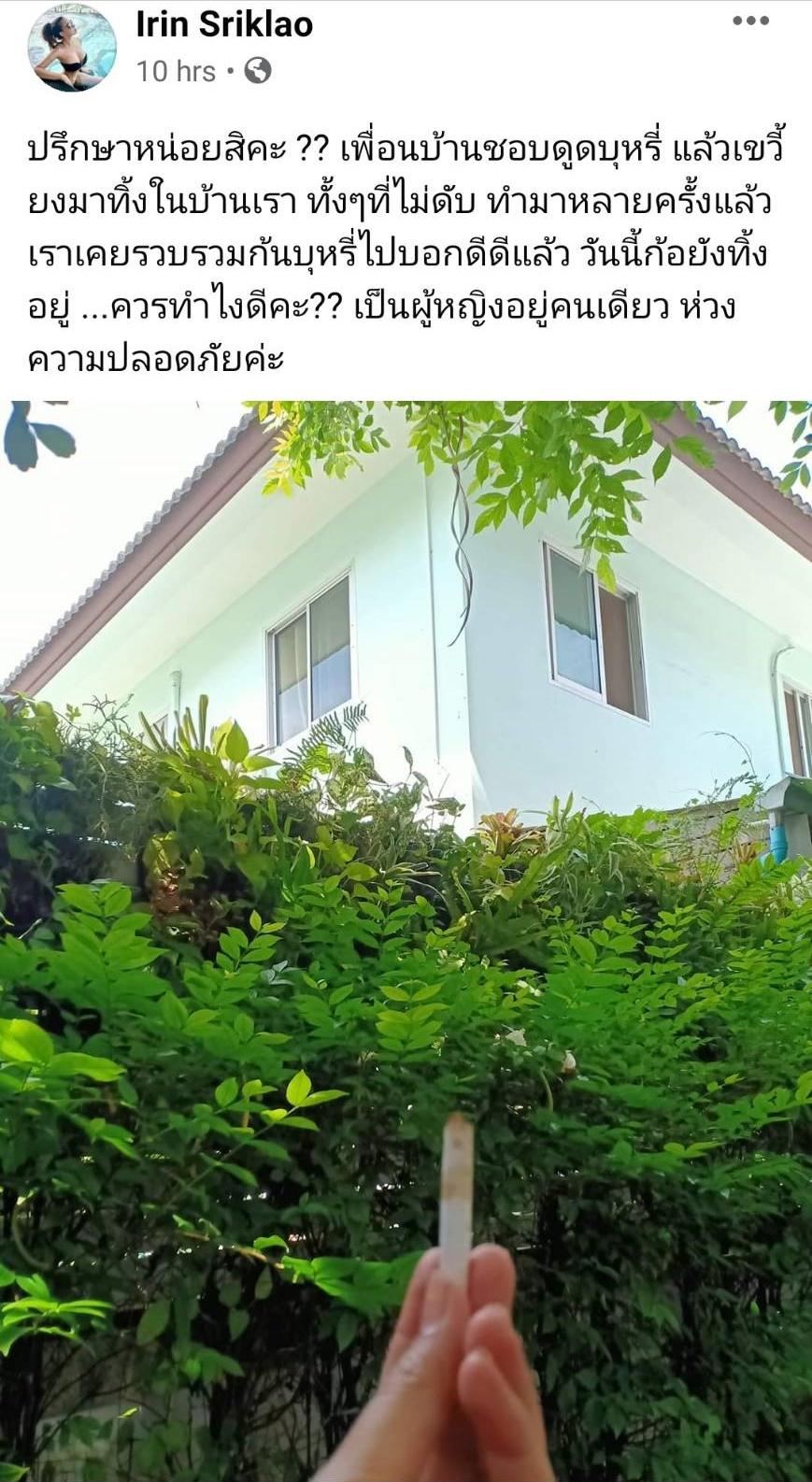 ซึ่ง เปิ้ล ไอริณ โพสต์ภาพก้นบุหรี่ พร้อมทั้งเขียนข้อความว่า “ปรึกษาหน่อยสิคะ?? เพื่อนบ้านชอบดูดบุหรี่ แล้วเขวี้ยงมาทิ้งในบ้านเรา ทั้งๆที่ไม่ดับ ทำมาหลายครั้งแล้ว เราเคยรวบรวมก้นบุหรี่ไปบอกดีดีแล้ว วันนี้ก้อยังทิ้งอยู่ ...ควรทำไงดีคะ?? เป็นผู้หญิงอยู่คนเดียว ห่วงความปลอดภัยค่ะ”
