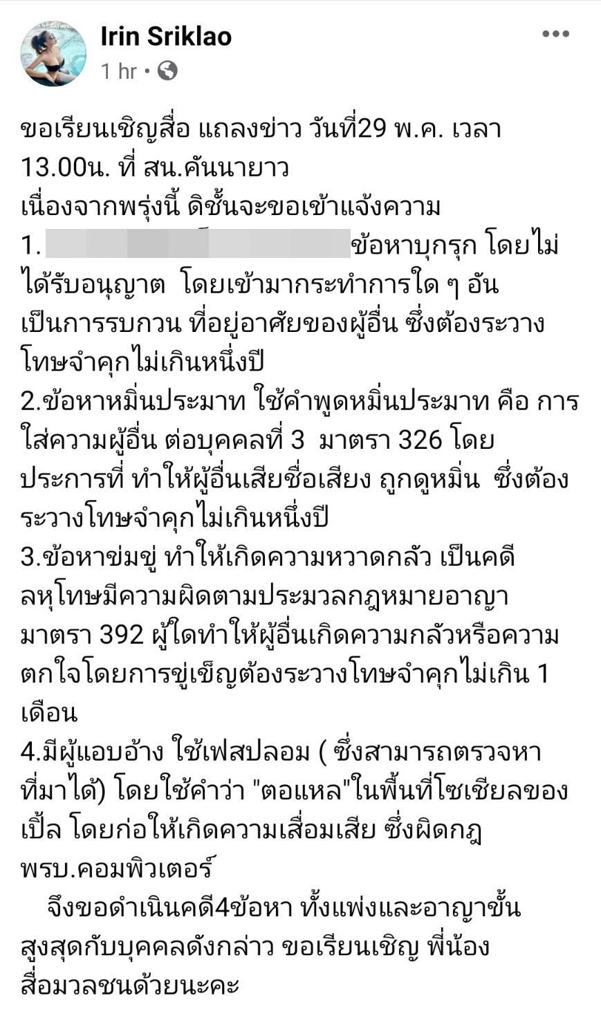 ก่อนจะโพสต์ข้อความเรียนเชิญสื่อมวลชนมาทำข่าวในวันที่ 29 พ.ค. 2563 โดยเจ้าตัวจะเข้าแจ้งความที่ สน.คันนายาว เพื่อให้ดำเนินคดี 4 ข้อหา ทั้งแพ่งและอาญาขั้นสูงสุดกับบุคคลดังกล่าว ดังนี้