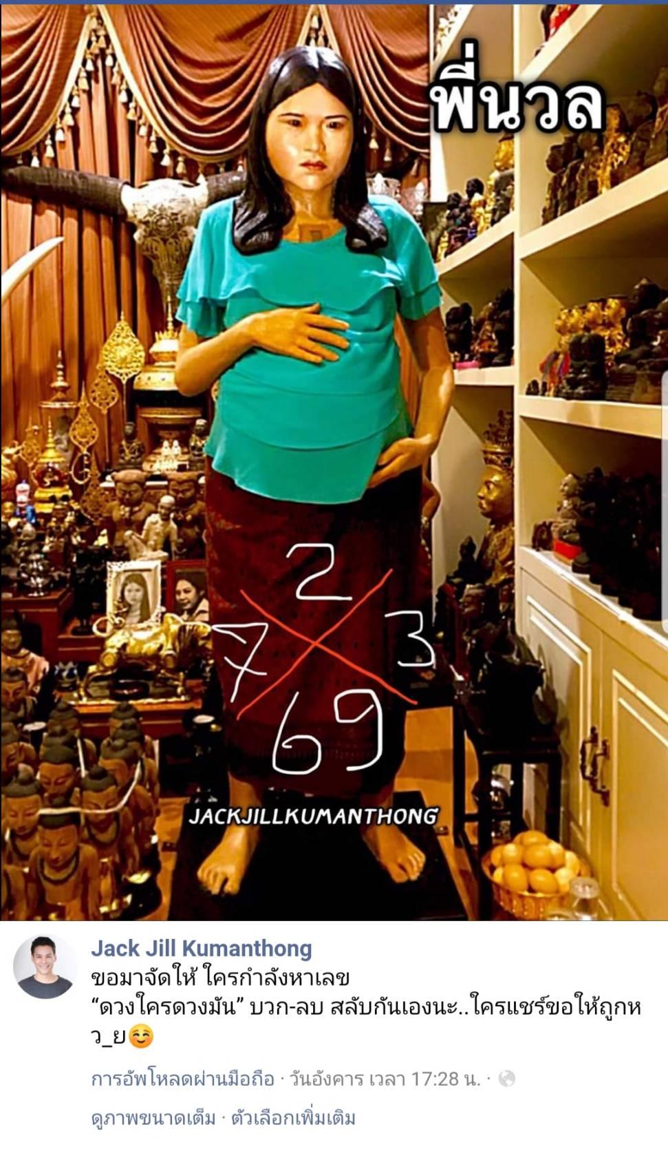 ล่าสุด จิลล์ จักรพงศ์ ได้โพสต์ภาพพี่นวลพร้อมกับเลขเด็ดผ่านเฟซบุ๊ก Jack Jill Kumanthong เพื่อให้คอหวยได้เสี่ยงโชคกันอีกแล้ว หลังจากให้หวยถูกมาหลายงวด ซึ่งในงวดนี้มีเลข 7 / 2 / 3 / 69 พร้อมทั้งเขียนแคปชั่น "ขอมาจัดให้ ใครกำลังหาเลข “ดวงใครดวงมัน” บวก-ลบ สลับกันเองนะ..ใครแชร์ขอให้ถูกหว_ย" โดยโพสต์ดังกล่าวได้ถูกแชร์ไปอย่างมากมาย