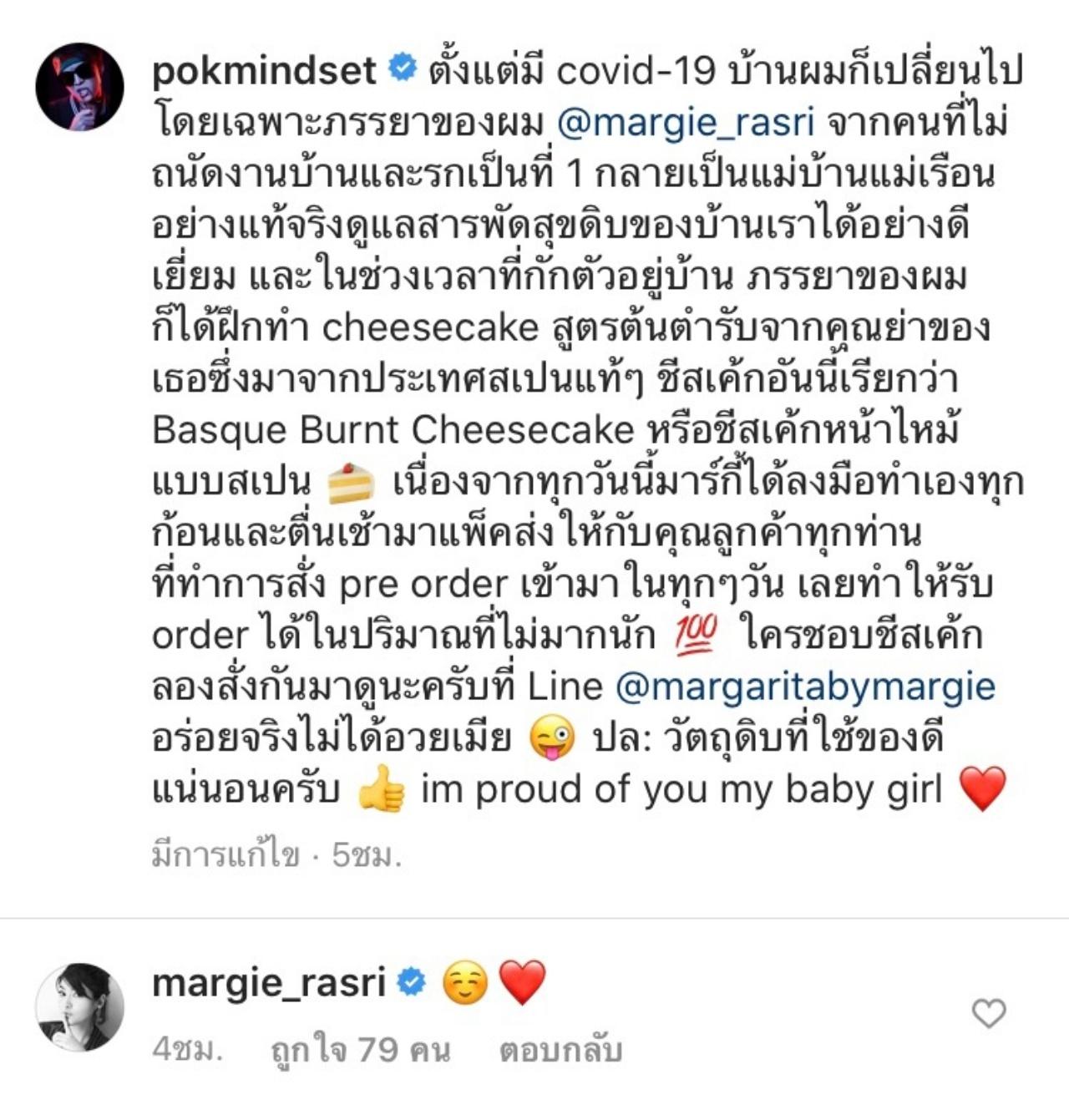 และเมื่อช่วงที่ผ่านมา ตั้งแต่มีโรคระบาดโควิด-19 ทำให้ทั้ง ป๊อกและมาร์กี้ ต้องหยุดพักงานชั่วคราว ซึ่งเป็นโอกาสดีที่ทั้งสองจะได้อยู่กับลูกตลอด 24 ชม. และแม่มาร์กี้ ก็ได้ค้นพบอาชีพใหม่ คือทำชีสเค้กขาย ได้กระแสตอบรับดีมาก มีออเดอร์เข้ามายาวเป็นหางว่าวเลยทีเดียว
