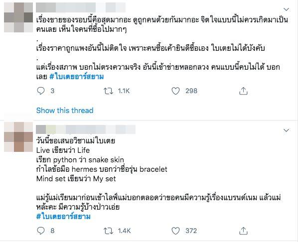 ส่วนเข็มขัด เค้าก็คงโทษขนส่งตามสเตป คงไม่มีใครแย่เท่าเราแล้วล่ะได้ของปลอม (มั้ง) แถมราคารวมเกือบ 48,000 แถมโดนด่า จะขอคืนก็ไม่คืน ยอมให้เค้าจ่ายเฉพาะเข็มขัด แค่ 7,000-8,000 ก็ยอม แต่เขาตอบไม่คืนอย่างเดียว มีคนถามแล้วไปซื้อทำไม!? เราก็ตอบไปว่าเขาเป็นคนดังคงไม่กล้าเอาชื่อเสียงตัวเองมาติดลบเรื่องหลอกขายของแบบนี้ จนวันนี้มีหลายคนที่เจอแบบเรา #ใบเตยอาร์สยาม”