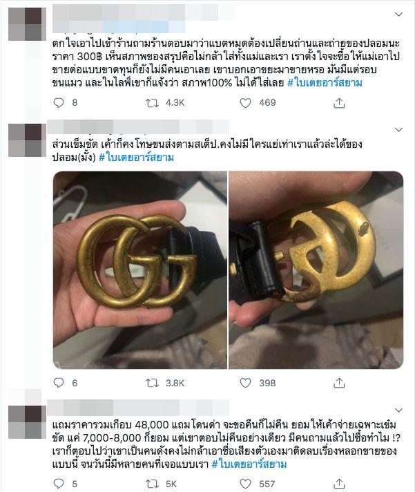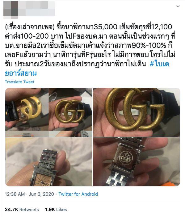 โดยมีผู้ใช้ทวิตเตอร์รายหนึ่งโพสต์ภาพเข็มขัด Gucci และภาพนาฬิกา พร้อมทั้งเขียนข้อความว่า “(เรื่องเล่าจากเพจ) ซื้อนาฬิกามา 35,000 เข็มขัดกุชชี่ 12,100 ค่าส่ง 100-200 บาท ไป F ของบต.มา ตอนนั้นเป็นช่วงแรกๆ ที่บต.ขายมือ 2 เราซื้อเข็มขัดมาเค้าแจ้งว่าสภาพ 90%-100% ก็เลย F แล้วถามว่า นาฬิการุ่นที่ F รุ่นอะไร ไม่มีการตอบโทรไปไม่รับ ประมาณ 2 วันของมาถึง ปรากฏว่านาฬิกาไม่เดิน