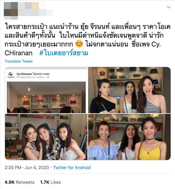 อีกทั้งยังแนะนำให้ซื้อกระเป๋าจาก ยุ้ย จีรนันท์ มะโนแจ่ม และเพื่อนๆ โดยเขียนข้อความว่า “ใครสายกระเป๋า แนะนำร้าน ยุ้ย จีรนันท์ และเพื่อนๆ ราคาโอเคและสินค้าดีๆ ทั้งนั้น ใบไหนมีตำหนิแจ้งชัดเจน พูดจาดี น่ารัก กระเป๋าสวยๆ เยอะมากกก ไม่จกตาแน่นอน”