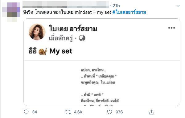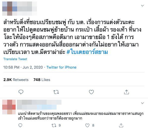 และยังเปรียบเทียบ ใบเตย อาร์สยาม กับ ชมพู่ อารยา เอ ฮาร์เก็ต เรื่องของแบรนด์เนมว่า “สำหรับติ่งที่ชอบเปรียบชมพู่ กับ บต. เรื่องการแต่งตัวนะคะ อยากให้ไปดูตอนชมพู่ย้ายบ้าน กระเป๋า เสื้อผ้า รองเท้า ที่นางโละให้น้องๆ คือสภาพคือดีมาก เอามาขายมือ 1 ยังได้ การวางตัว การแสดงออกมันสื่อออกมาต่างกันไม่อยากให้เอามาเปรียบเวลา บต. มีดราม่าอ่ะ #ใบเตยอาร์สยาม”.
