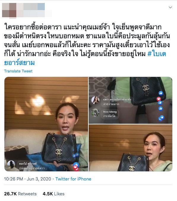 นอกจากนี้ ยังมีชาวทวิตเตอร์หลายคนแนะนำว่าหากจะซื้อของต่อจากดาราให้ไปซื้อที่ เมย์ เฟื่องอารมย์ โดยบอกว่า “ใครอยากซื้อต่อดารา แนะนำคุณเมย์จ้า ใจเย็นพูดจาดีมาก ของมีตำหนิตรงไหนบอกหมด ชาแนลใบนี้คือประมูลกันลุ้นกันจนสั่น เมย์บอกพอแล้วก็ได้นะคะ ราคามันสูงเดี๋ยวเอาไว้ใช้เองก็ได้ น่ารักมากอ่ะ คือจริงใจ ไม่รู้ตอนนี้ยังขายอยู่ไหม #ใบเตยอาร์สยาม”