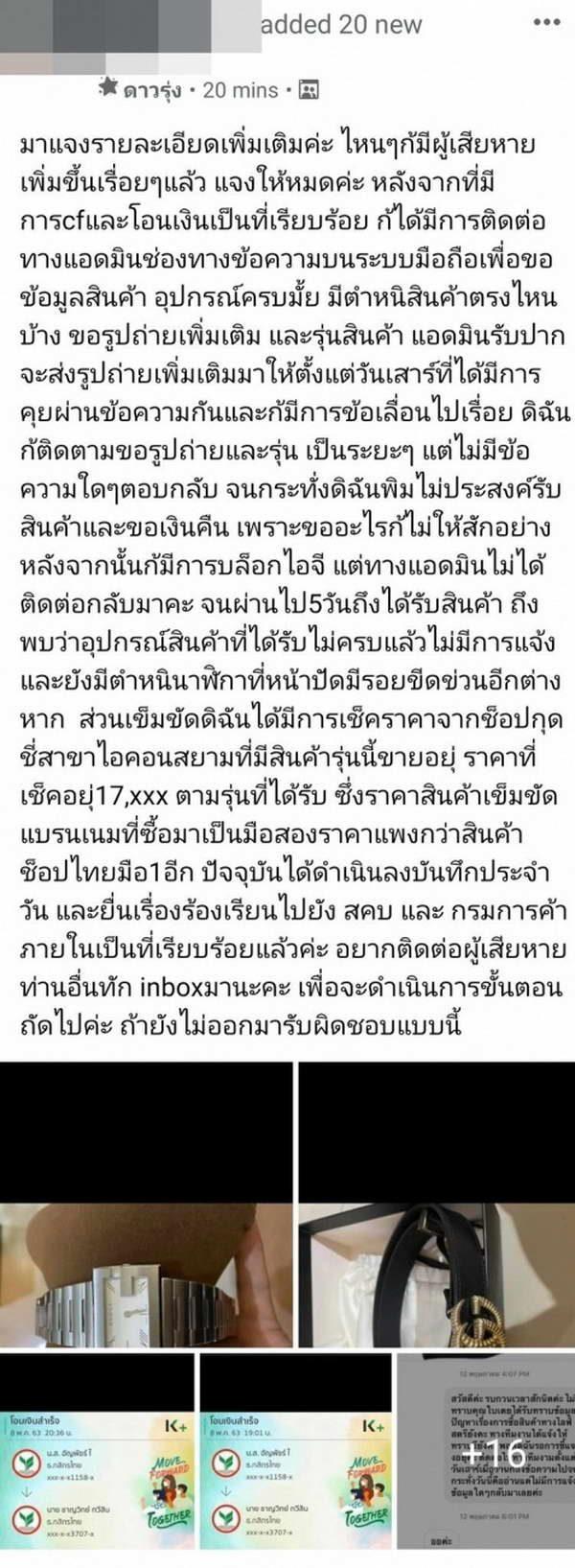 นอกจากนี้ ยังมีลูกค้ารายหนึ่งที่ซื้อของแบรนด์เนมมือสองจากนักร้องดัง ขอดูภาพเพิ่มเติมและตำหนิสินค้าก่อนตัดสินใจรับของ ซึ่งแอดมินรับปากว่าจะส่งมาให้ แต่ก็เงียบหายไป จนกระทั่งบอกว่าไม่ขอรับสินค้าและขอเงินคืน หลังจากนั้นก็มีการบล็อกไอจี จนผ่านไป 5 วันก็ได้รับสินค้า แต่อุปกรณ์สินค้าไม่ครบแล้วไม่มีการแจ้ง และมีตำหนิที่นาฬิกา ส่วนเข็มขัดแบรนด์เนมมือสองขายในราคาแพงกว่าสินค้าช็อปไทยมือหนึ่ง ซึ่งตอนนี้ได้ไปลงบันทึกประจำวันและยื่นเรื่องร้องเรียนไปยัง สคบ. และกรมการค้าภายในเรียบร้อยแล้ว