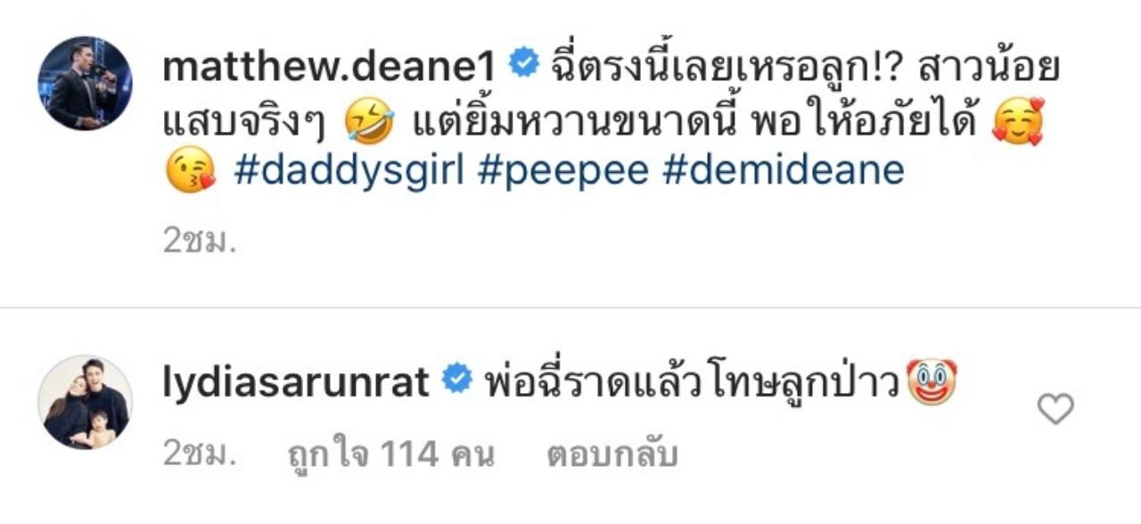เป็นครอบครัวที่น่ารักมาก สำหรับครอบครัวของ แมทธิว ดีน กับ ลีเดีย ศรัณย์รัชต์ ที่ตอนนี้ลูกชาย-ลูกสาว น้องดีแลน กับน้องเดมี่ ต่างครองใจพี่ป้าน้าอาแฟนคลับ ซึ่งในทุกๆ วัน พ่อแมทธิวกับแม่ลีเดีย จะอัปเดตภาพลูกสาวลูกชายผ่านอินสตาแกรม ซึ่งเรียกยอดไลค์ กดหัวใจกันรัวๆ เลยทีเดียว