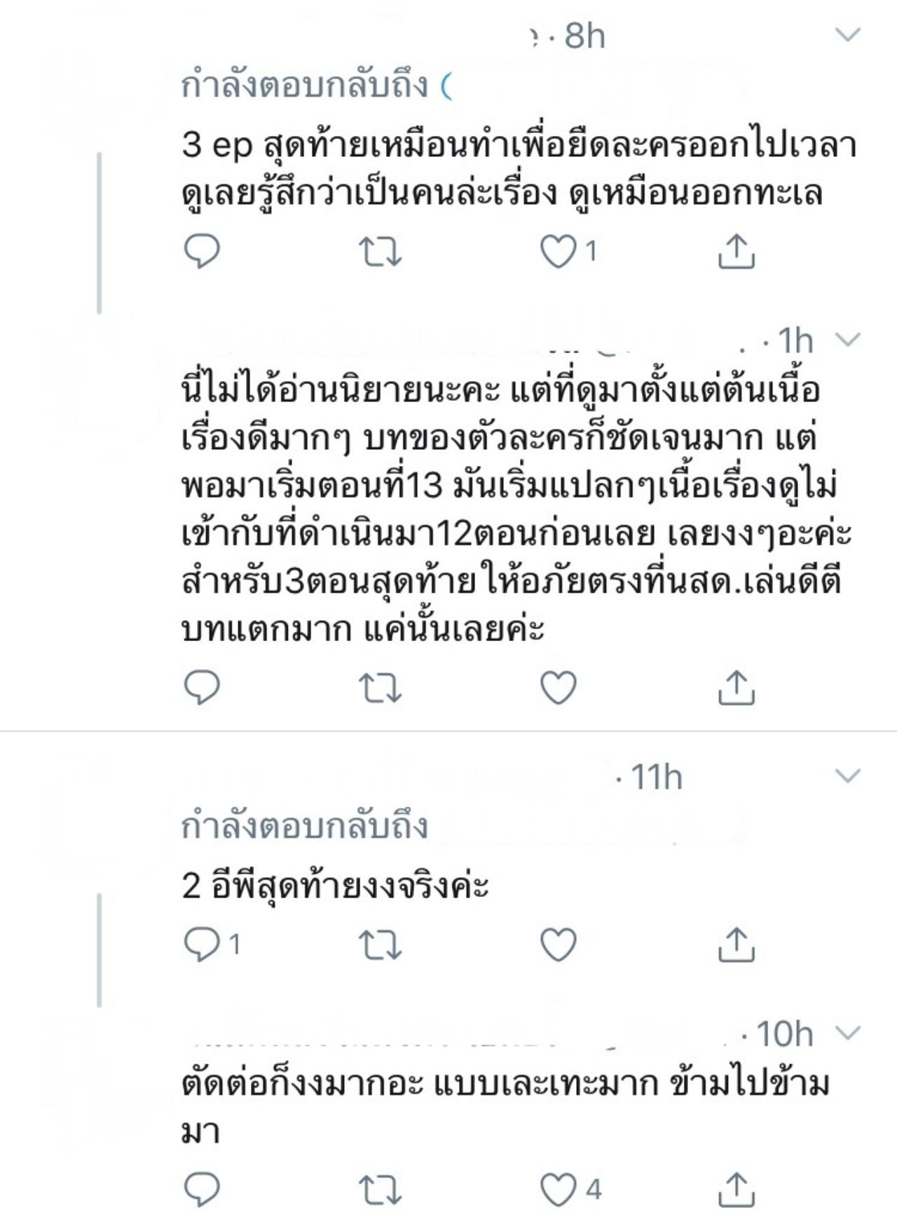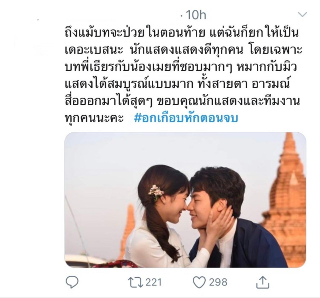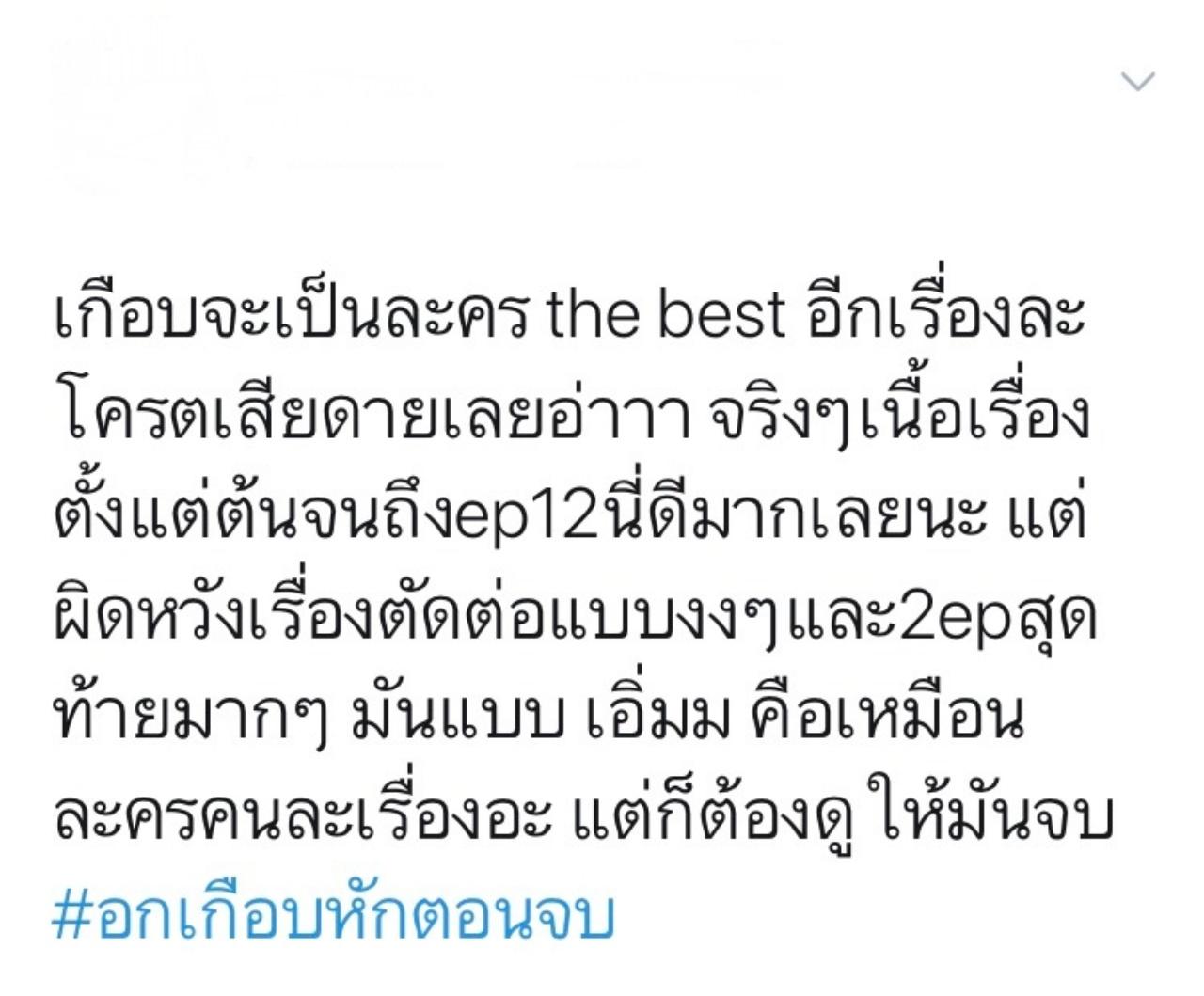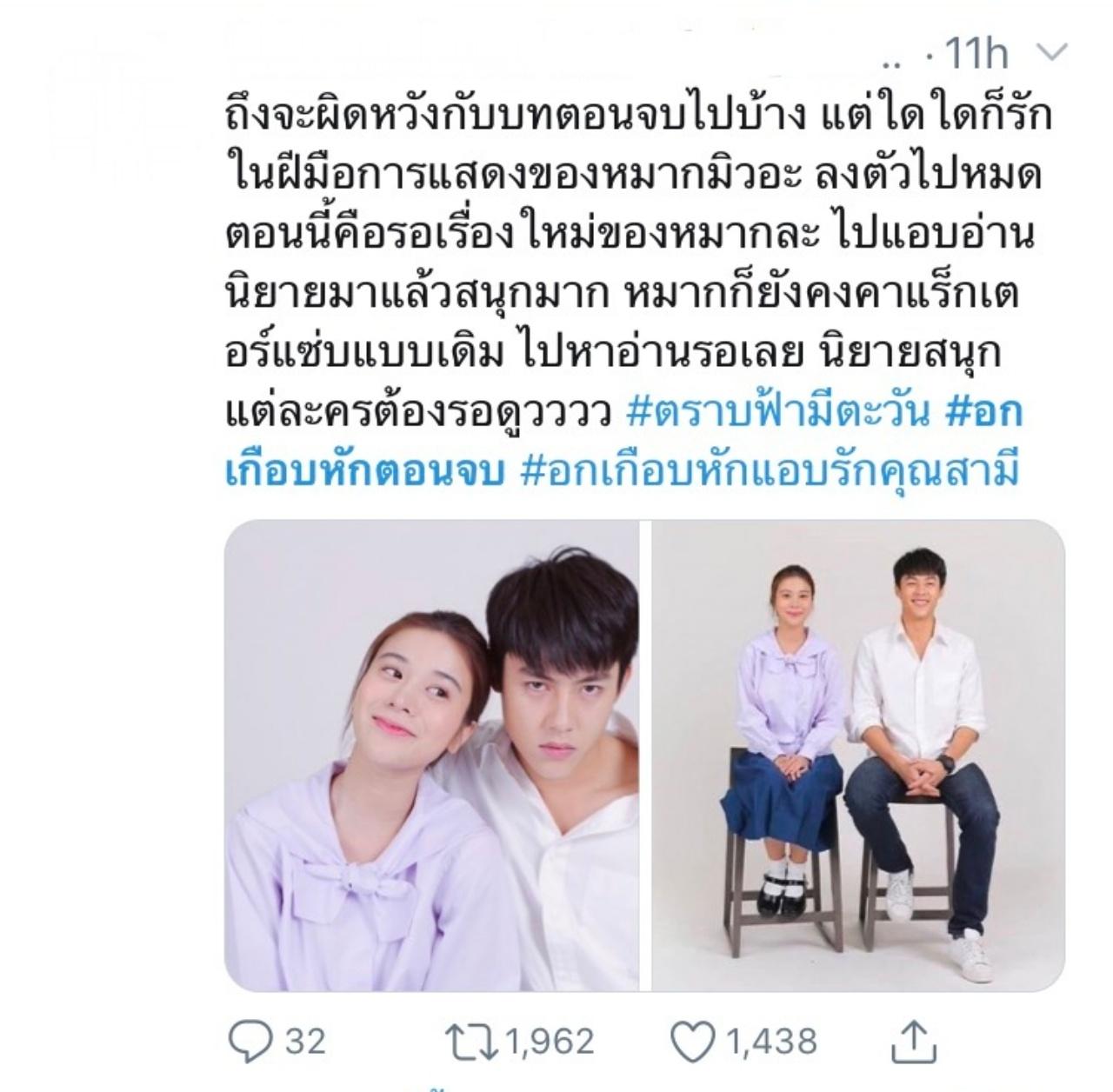 นอกจากนี้ หลายคนต่างก็บอกว่า ไม่อยากให้ละครเรื่องนี้จบ เพราะเคมีคู่พระนางของ หมาก ปริญ กับ มิว นิษฐา นั้นลงตัวดีมาก และหลงรักตัวละครทุกตัวในเรื่องนี้มากๆ โดยเฉพาะกลุ่มเพื่อนพระเอกที่มีความบอยแบนด์สุดๆ พร้อมกับร้องขอกับทางผู้จัดว่า ขอละครให้ หมาก มิว เล่นคู่กันอีกได้มั้ย