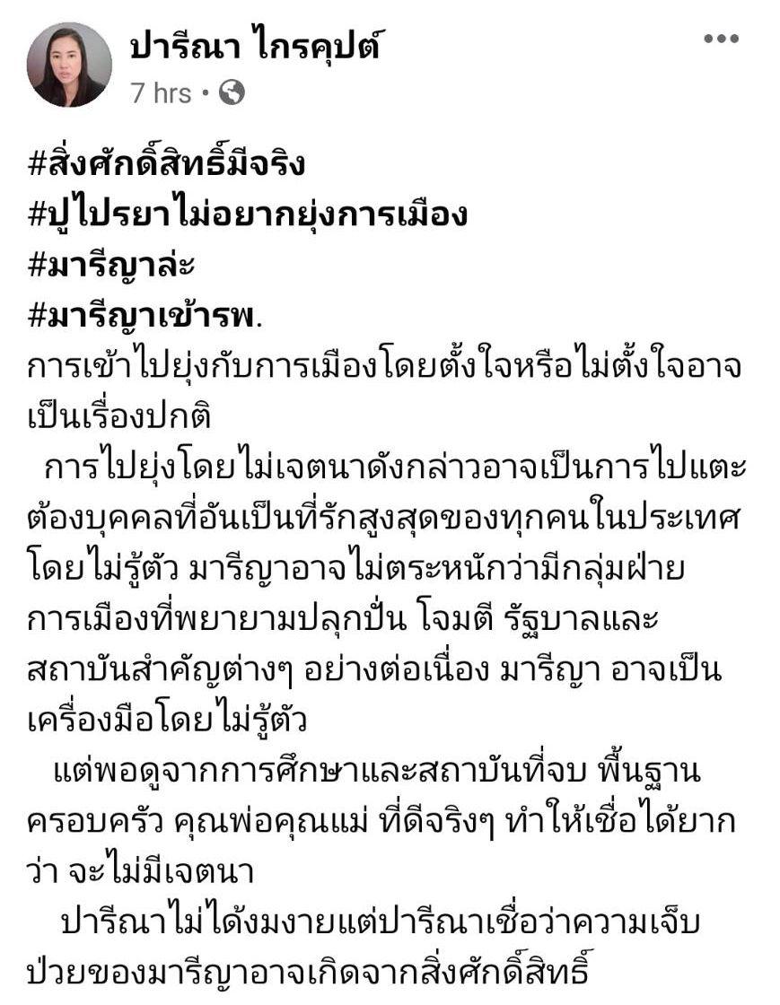 ล่าสุด เอ๋ ปารีณา ไกรคุปต์ ส.ส.ราชบุรี พรรคพลังประชารัฐ โพสต์ภาพข่าว มารีญา ป่วยลำไส้อักเสบ พร้อมทั้งเขียนข้อความว่า “#สิ่งศักดิ์สิทธิ์มีจริง #ปูไปรยาไม่อยากยุ่งการเมือง #มารีญาล่ะ #มารีญาเข้ารพ. การเข้าไปยุ่งกับการเมืองโดยตั้งใจหรือไม่ตั้งใจอาจเป็นเรื่องปกติ การไปยุ่งโดยไม่เจตนาดังกล่าวอาจเป็นการไปแตะต้องบุคคลที่อันเป็นที่รักสูงสุดของทุกคนในประเทศโดยไม่รู้ตัว