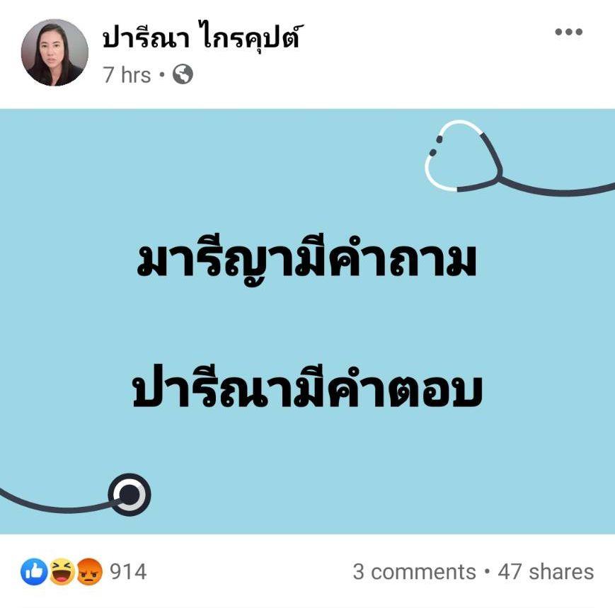 #ปารีณา: วันเฉลิมอยู่เขมร และไทยไม่สามารถไปแทรกแซงอธิปไตยของกัมพูชาได้ ขนาดวันเฉลิมปลูกและขายกัญชาทางโซเชียลอย่างเปิดเผย เรายังไปจับวันเฉลิมที่กัมพูชาไม่ได้เลย”.