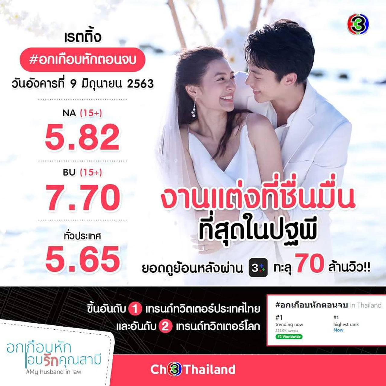 แรงยันโค้งสุดท้าย สำหรับ ละคร “อกเกือบหักแอบรักคุณสามี” ทาง ช่อง 3 ของ ผู้จัด “แอน ทองประสม” บริษัท ทอง เอ็นเตอร์เทนเม้นต์ ที่ลาจอไปอย่างสวยงาม เมื่อคืนวันอังคารที่ผ่านมา (9 มิถุนายน) ด้วยเรตติ้ง ทั่วประเทศ อยู่ที่ 5.65 ส่วน ทั่วประเทศ (15+) อยู่ที่ 5.82 แต่ที่นำโด่ง คือ ในพื้นที่กรุงเทพฯ อายุ 15 ปีขึ้นไป หรือ BU (15+) สูงถึง 7.70 ด้านโซเชียลก็ครองแชมป์เหนียวแน่นต่อเนื่อง ขึ้นอันดับ 1 เทรนด์ทวิตเตอร์ประเทศไทยทุกสัปดาห์ ตั้งแต่ละครเริ่มจนอวสาน ส่วนเทรนด์ทวิตเตอร์โลก ลาจอไปที่ อันดับ 2 แต่ความพีคยังแรงไม่หยุด เมื่อยอดดูย้อนหลัง ผ่านแอป CH3+ พุ่งทะลุถึง 70 ล้านวิว