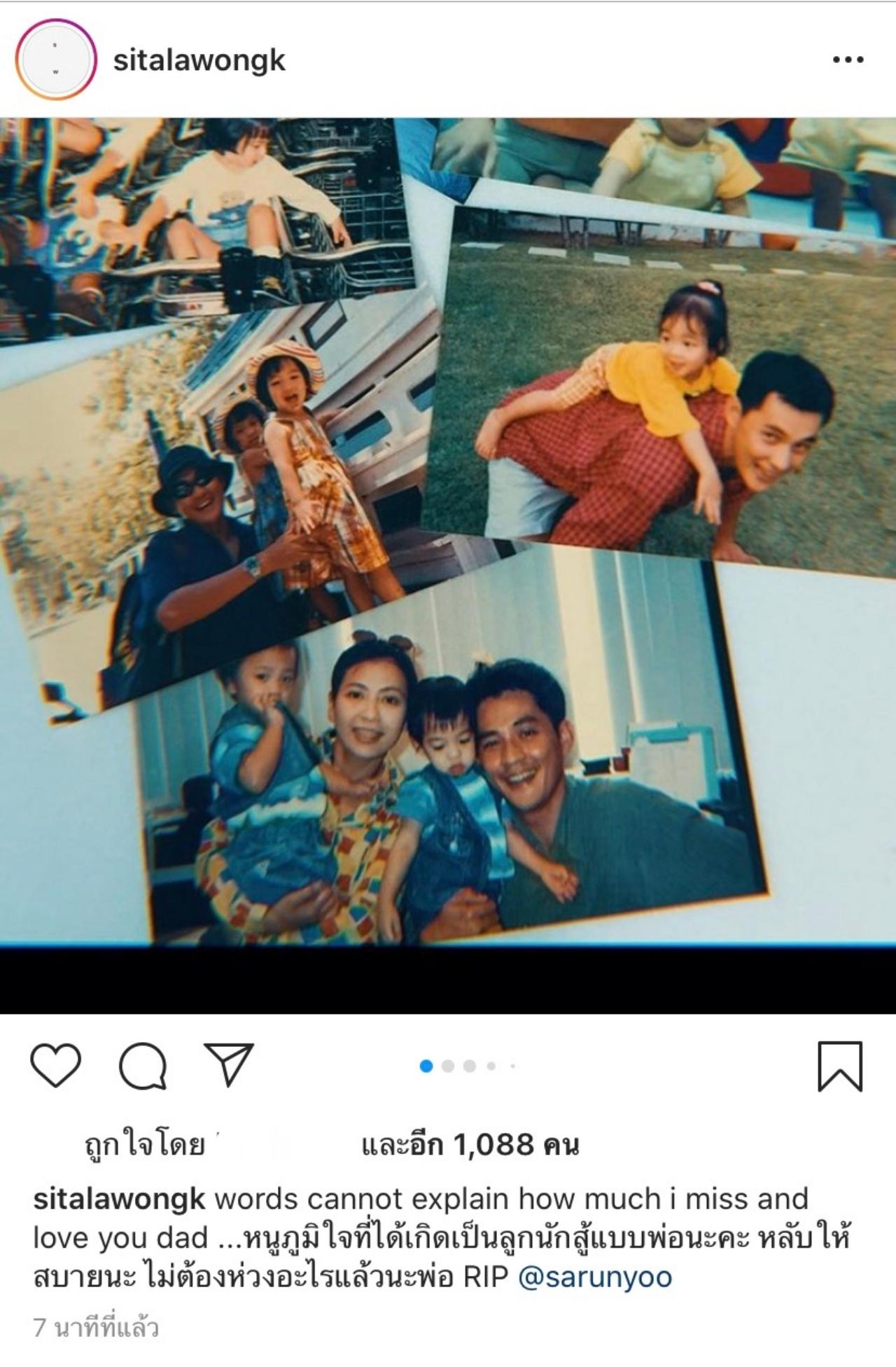 "words cannot explain how much i miss and love you dad ...หนูภูมิใจที่ได้เกิดเป็นลูกนักสู้แบบพ่อนะคะ หลับให้สบายนะ ไม่ต้องห่วงอะไรแล้วนะพ่อ RIP @sarunyoo" (ไม่มีคำพูดใดมาอธิบายได้ว่าหนูคิดถึงและรักพ่อมากแค่ไหน)