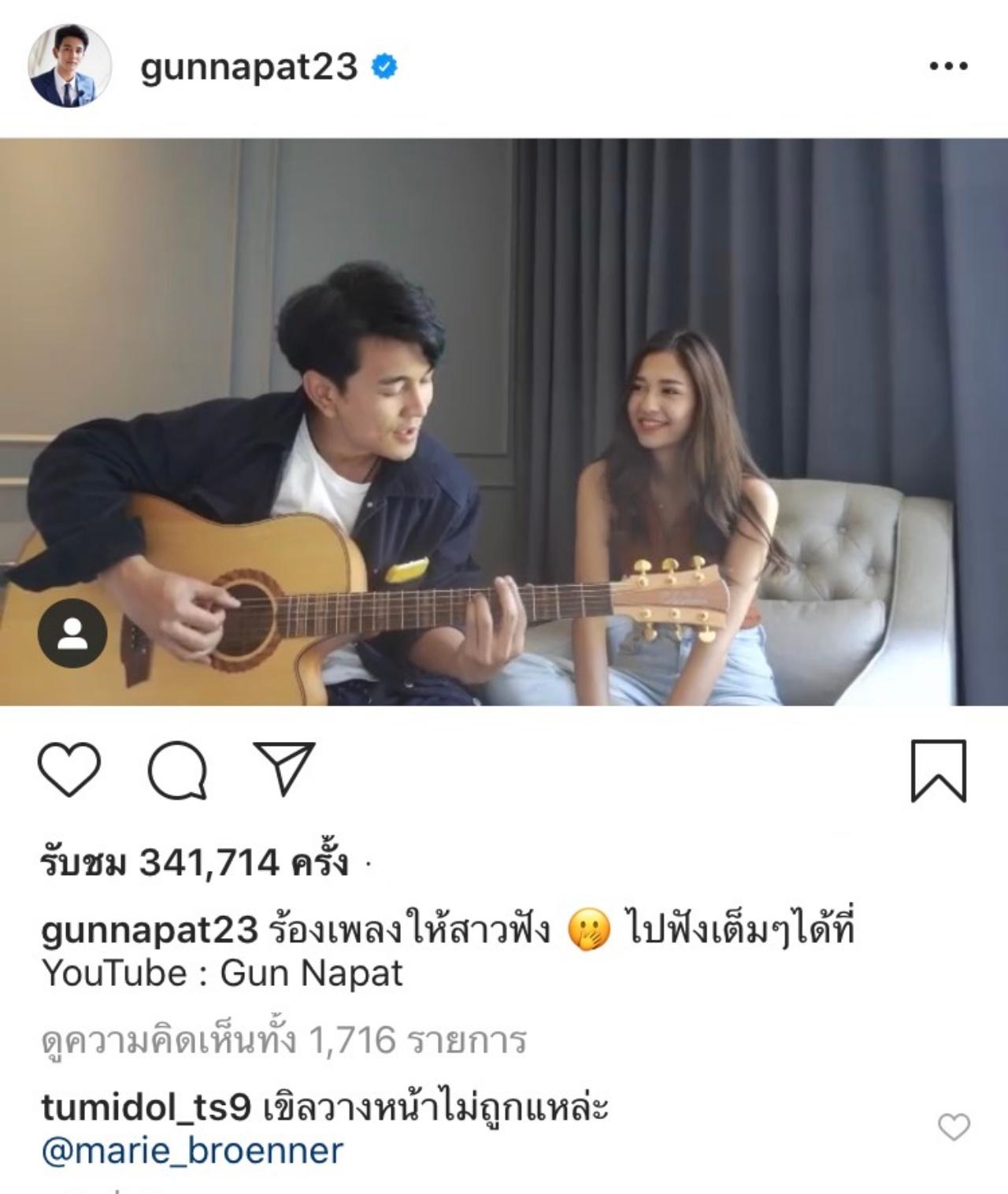 ต้องบอกเลยว่า รอบนี้หวานสุดๆ เพราะหนุ่ม กัน ได้โพสต์คลิปเล่นกีตาร์ร้องเพลง ลม ของ หนุ่ม กะลา โดยมี มารี นั่งฟังแบบเขินๆ อยู่ข้างๆ ซึ่ง กัน ก็บอกว่า "เพลงนี้มอบให้กับคุณนะครับ" ทำเอาฝ่ายหญิงเขิน และถามแบบเขินๆ ว่า "ให้เค้าเหรอ" กันก็บอกว่า "Yes"