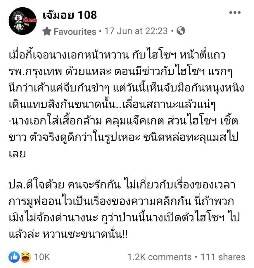 โดยเพจ เจ๊มอย 108 ได้โพสต์เม้าท์ถึงนางเอกหน้าหวานและไฮโซหน้าตี๋ว่า "เมื่อกี้เจอนางเอกหน้าหวาน กับไฮโซฯ หน้าตี๋แถว รพ.กรุงเทพ ด้วยแหละ ตอนมีข่าวกับไฮโซฯ แรกๆ นึกว่าเค้าแค่จีบกันขำๆ แต่วันนี้เห็นจับมือกันหนุงหนิง เดินแทบสิงกันขนาดนั้น..เลื่อนสถานะแล้วแน่ๆ