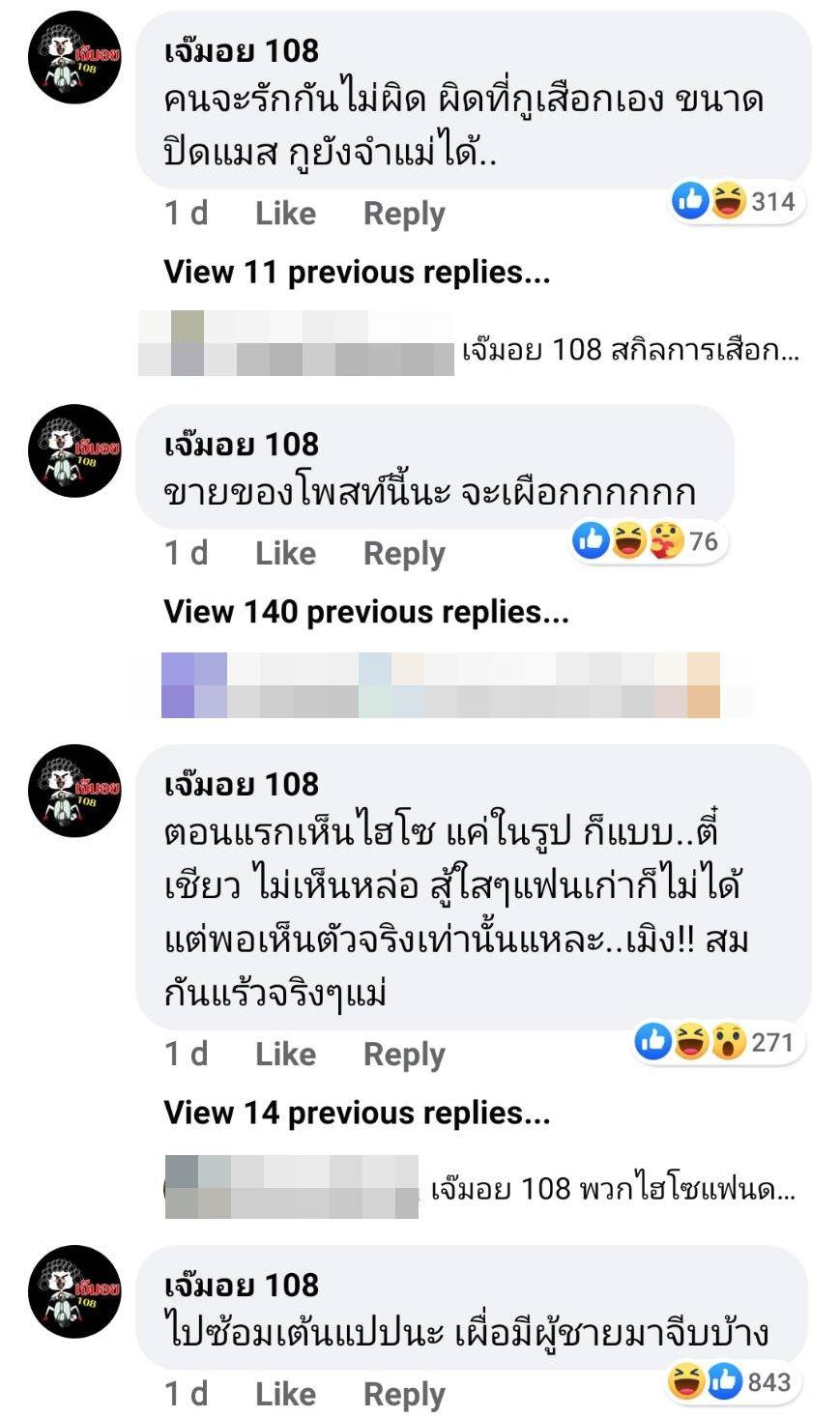 นอกจากนี้ เจ๊มอย 108 ยังใบ้เพิ่มเติมในคอมเมนต์อีกหลายข้อความ อาทิ "คนจะรักกันไม่ผิด ผิดที่กูเสื_กเอง ขนาดปิดแมส กูยังจำแม่ได้..", "ตอนแรกเห็นไฮโซ แค่ในรูป ก็แบบ..ตี๋เชียว ไม่เห็นหล่อ สู้ใสๆ แฟนเก่าก็ไม่ได้ แต่พอเห็นตัวจริงเท่านั้นแหละ..เมิง!! สมกันแร้วจริงๆ แม่", "ไปซ้อมเต้นแป๊บนะ เผื่อมีผู้ชายมาจีบบ้าง"