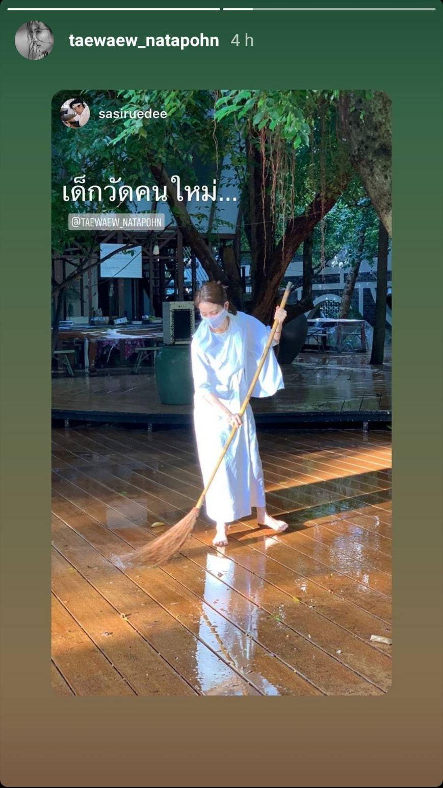 นอกจากนี้ แต้ว ณฐพร ยังได้โพสต์ไอจีสตอรี่เป็นภาพบรรยากาศของสถานปฏิบัติธรรมชื่อดัง รวมทั้งรีโพสต์ภาพในไอจีสตอรี่ที่เป็นภาพตอนที่ตนเองกำลังกวาดพื้นสถานปฏิบัติธรรมที่เขียนแคปชั่นว่า “เด็กวัดคนใหม่” ด้วย บันเทิงไทยรัฐออนไลน์ขออนุโมทนาบุญกับสาวแต้วด้วยนะคะ.
