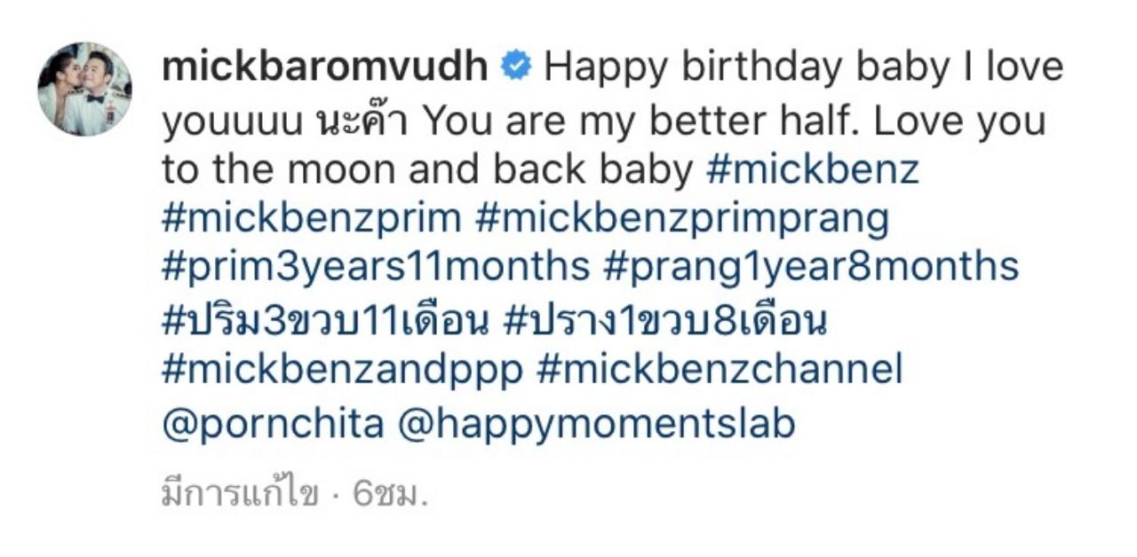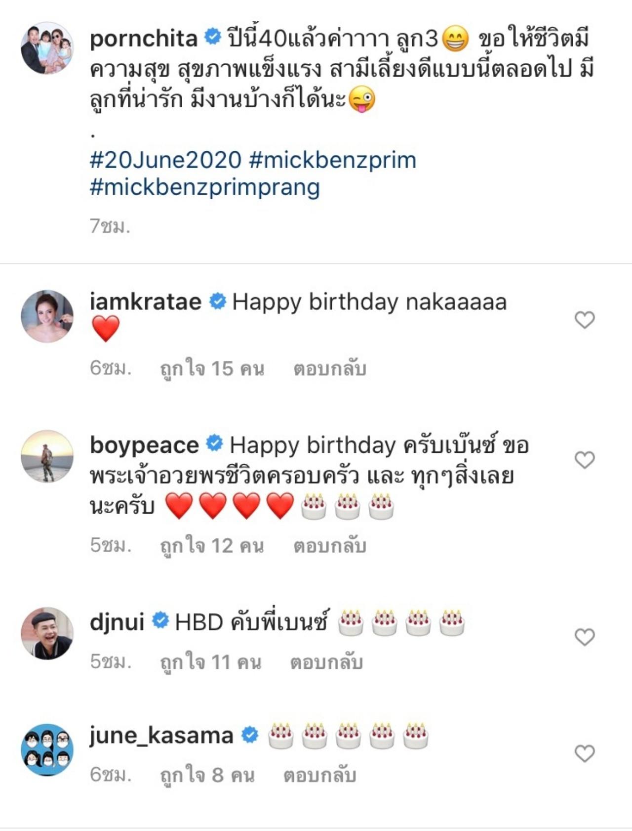 ด้านเจ้าของวันเกิด เบนซ์ ก็ได้ลงภาพเช่นกัน พร้อมกับเขียนว่า "ปีนี้40แล้วค่าาาา ลูก3 ขอให้ชีวิตมีความสุข สุขภาพแข็งแรง สามีเลี้ยงดีแบบนี้ตลอดไป มีลูกที่น่ารัก มีงานบ้างก็ได้นะ"