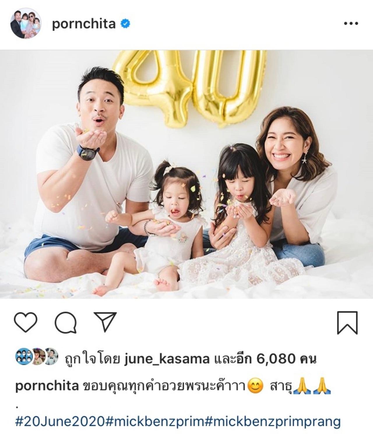 โดยสามี มิค บรมวุฒิ ก็ได้ลงภาพอวยพรวันเกิดภรรยาในวันที่อายุครบ 40 ปีบริบูรณ์ว่า "Happy birthday นะแม่ พ่อรักแม่นะคะ รักที่สุดเลย ขอให้แม่มีแต่ความสุข สุขภาพแข็งแรง คิดสิ่งใดก็สมดังปรารถนาทุกอย่างนะคะ I love you baby."