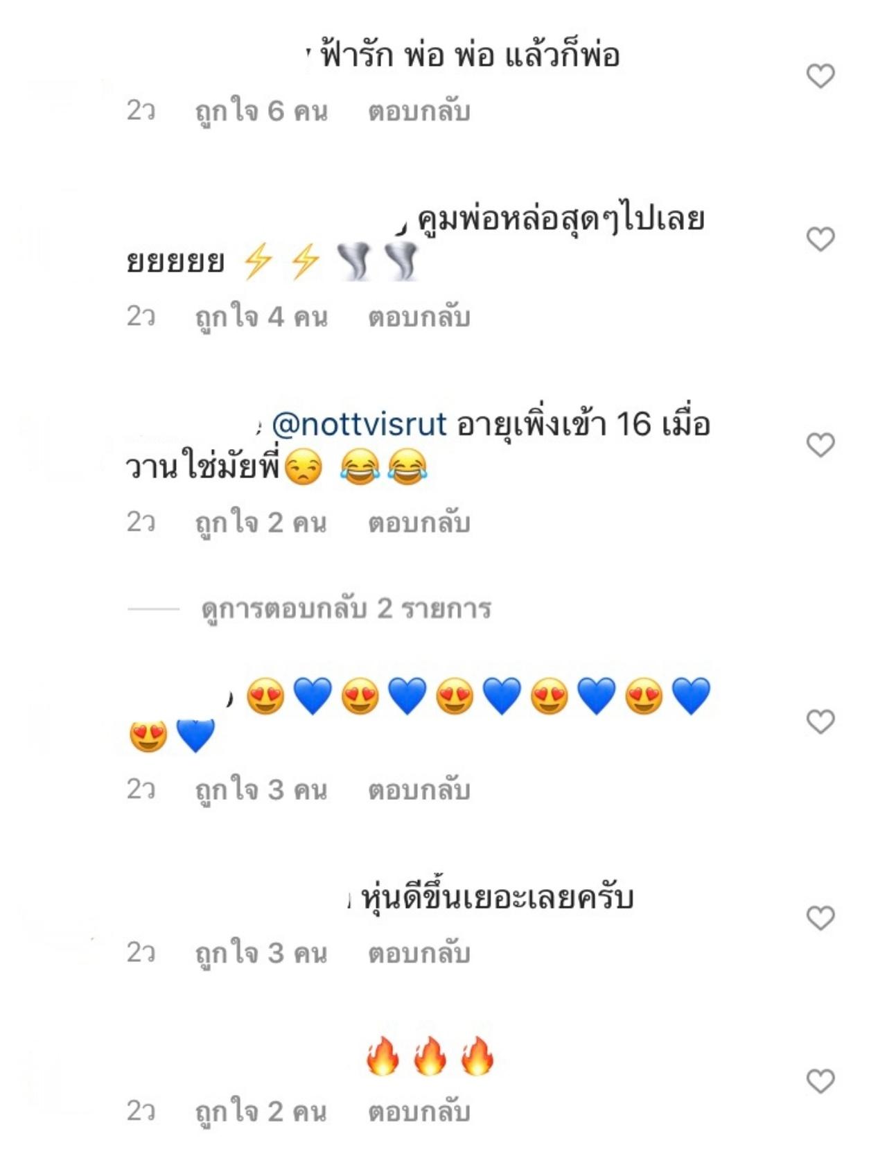 โดยแฟนๆ ที่ติดตามต่างเข้ามาคอมเมนต์ กดไลค์ส่งหัวใจให้ พ่อน็อต กันรัวๆ และต่างบอกเป็นเสียงเดียวกันว่า รูปนี้พ่อหล่อมาก ถึงไม่ถอดเสื้อ แต่รู้เลยว่า พ่อล่ำสุดๆ พร้อมกับปาหัวใจกันรัวๆ เลยทีเดียว.