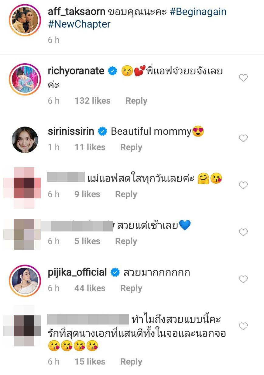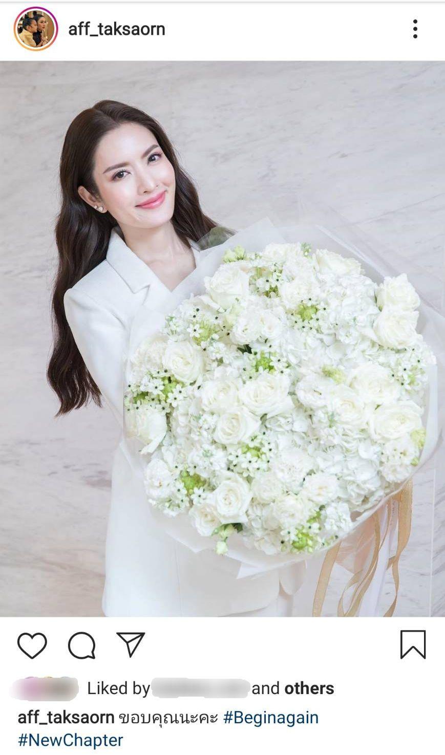 แต่ล่าสุด แอฟ ทักษอร โพสต์ภาพตัวเองกับช่อดอกไม้สีขาวช่อโต พร้อมทั้งเขียนแคปชั่น “ขอบคุณนะคะ #Beginagain #NewChapter” งานนี้มีทั้งคนชื่นชมภาพนี้ว่าเจ้าตัวสวยมาก สวยงามคู่ควรกับดอกไม้มาก สวยทั้งคนทั้งดอกไม้ รวมไปถึงคอมเมนต์ที่ถามกันตรงๆ ว่า “หนุ่มคนไหนให้คะแม่พี่ปี”