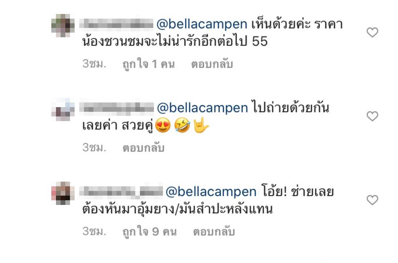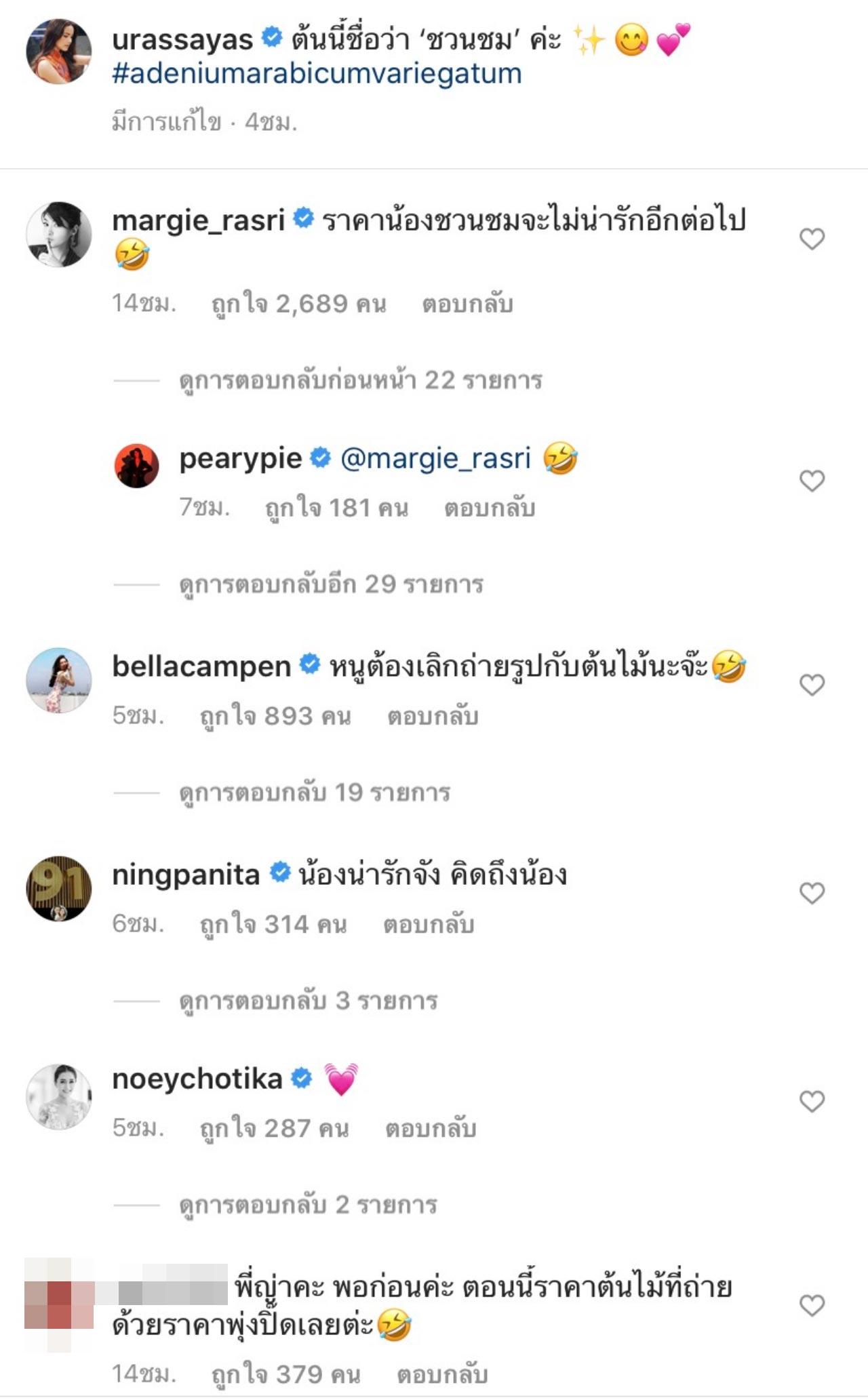 หลังจากที่นางเอกสาว ญาญ่า อุรัสยา โพสต์รูปดังกล่าวไป 2 นางเอกรุ่นพี่อย่าง มาร์กี้ ราศรี ก็เข้ามาคอมเมนต์ว่า “ราคาน้องชวนชมจะไม่น่ารักอีกต่อไป” และ เบลล่า ราณี ก็คอมเมนต์ต่อว่า “หนูต้องเลิกถ่ายรูปกับต้นไม้นะจ๊ะ”
