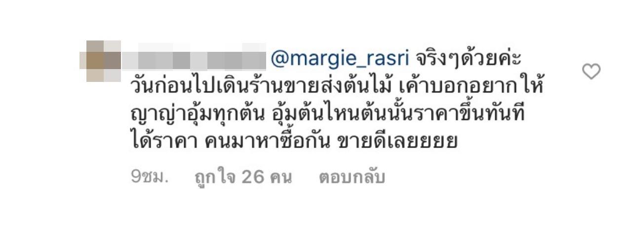 ซึ่งก็มีชาวเน็ตเข้ามาคอมเมนต์เห็นด้วยกับมาร์กี้และเบลล่า พร้อมกับบอกว่า พอก่อนค่ะ ตอนนี้ราคาต้นไม้ที่ถ่ายด้วยราคาพุ่งปี๊ดเลย, จริงๆ ด้วยค่ะ วันก่อนไปเดินร้านขายส่งต้นไม้ เค้าบอกอยากให้ญาญ่าอุ้มทุกต้น อุ้มต้นไหนต้นนั้นราคาขึ้นทันที ได้ราคา คนมาหาซื้อกัน ขายดีเลย, โอ้ย ใช่เลย ต้องหันมาอุ้มยาง/มันสำปะหลังแทน