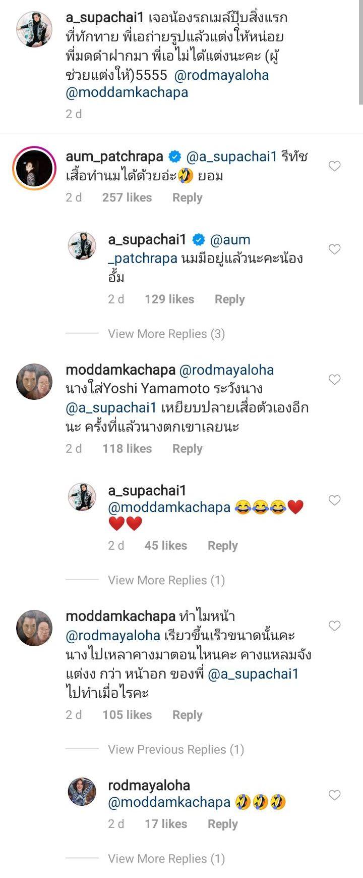 งานนี้นอกจากจะมีแฟนๆ แห่คอมเมนต์แซวหนักมากแล้ว ยังมี อั้ม พัชราภา ถึงกับคอมเมนต์ว่า “รีทัชเสื้อทำนมได้ด้วยอ่ะ ยอม” ด้านพิธีกรฝีปากกล้า มดดำ คชาภา ตันเจริญ ก็แซวว่า “ทำไมหน้า @rodmayaloha เรียวขึ้นเร็วขนาดนั้นคะ นางไปเหลาคางมาตอนไหนคะ คางแหลมจัง แต่งงกว่า หน้าอกของพี่ @a_supachai1 ไปทำเมื่อไรคะ” และ “@rodmayaloha นางใส่ Yoshi Yamamoto ระวังนาง @a_supachai1 เหยียบปลายเสื้อตัวเองอีกนะ ครั้งที่แล้วนางตกเขาเลยนะ” เล่นเอา เอ ศุภชัย และ รถเมล์ คะนึงนิจ คอมเมนต์ตอบกลับเป็นอีโมจิขำน้ำตาไหลเลยทีเดียว.
