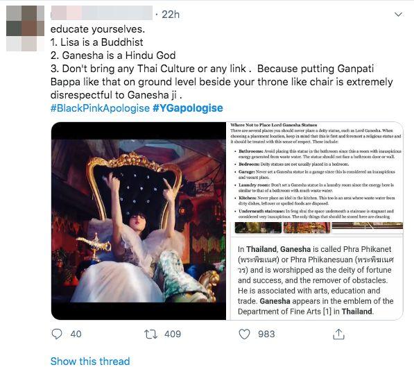 แต่ก็มี Blink (บลิงก์) ชาวไทย หรือแฟนคลับวง Blackpink ชาวไทย ออกมาชี้แจงว่าในประเทศไทยก็เคารพพระพิฆเนศเช่นเดียวกับชาวศาสนาฮินดูเช่นกัน อีกทั้งพระพิฆเนศยังเป็นตราประจำกรมศิลปากรของประเทศไทย และเป็นสัญลักษณ์ประจำมหาวิทยาลัยศิลปากร มหาวิทยาลัยชื่อดังในประเทศไทย และปกป้อง ลิซ่า Blackpink ว่าไม่มีเจตนาจะลบหลู่ศาสนาฮินดูอย่างแน่นอน.