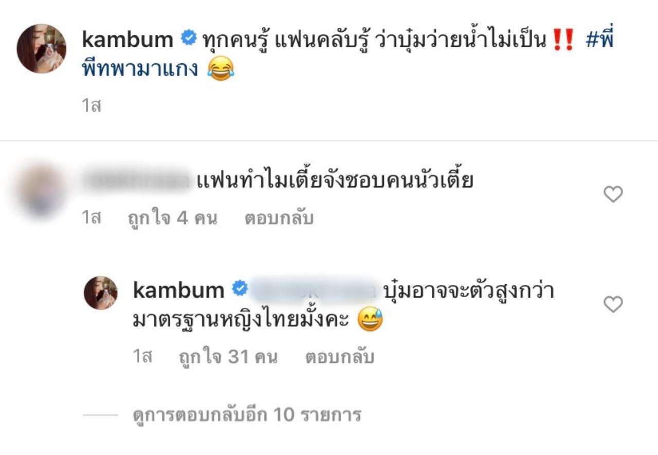 “เเฟนทำไมเตี้ยจังชอบคนตัวเตี้ย” ซึ่งหลังจากที่ถูกชาวเน็ตคนดังกล่าวเข้ามาถามอย่างนี้ สาวแก้มบุ๋มก็ตอบแบบรักษาน้ำใจของชาวเน็ตคนดังกล่าวว่า “บุ๋มอาจจะตัวสูงกว่ามาตรฐานหญิงไทยมั้งคะ”