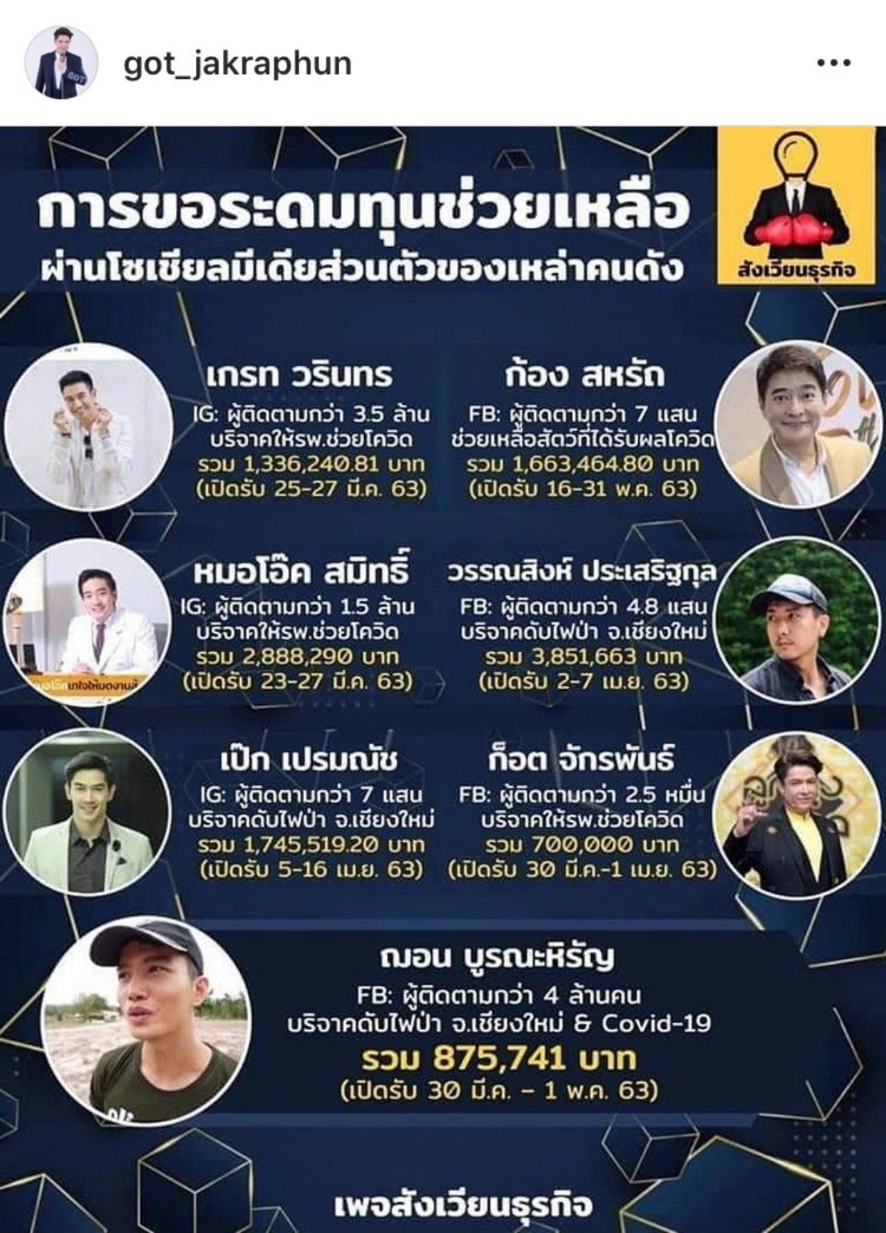 งานนี้เลยทำให้ ก๊อท ไม่พอใจกับข้อความดังกล่าว เจ้าตัวก็ได้เขียนชี้แจงเรื่องนี้ในอินสตาแกรม โดยบอกว่า เงิน 7 แสนที่โอนบริจาคนั้นเป็นเงินส่วนตัว และที่เคยไลฟ์ก็เพื่อช่วยมูลนิธิต่างๆ โดยให้โอนเงินผ่านมูลนิธิเลย พร้อมกับบอกว่า อย่ามายุ่งกับผม