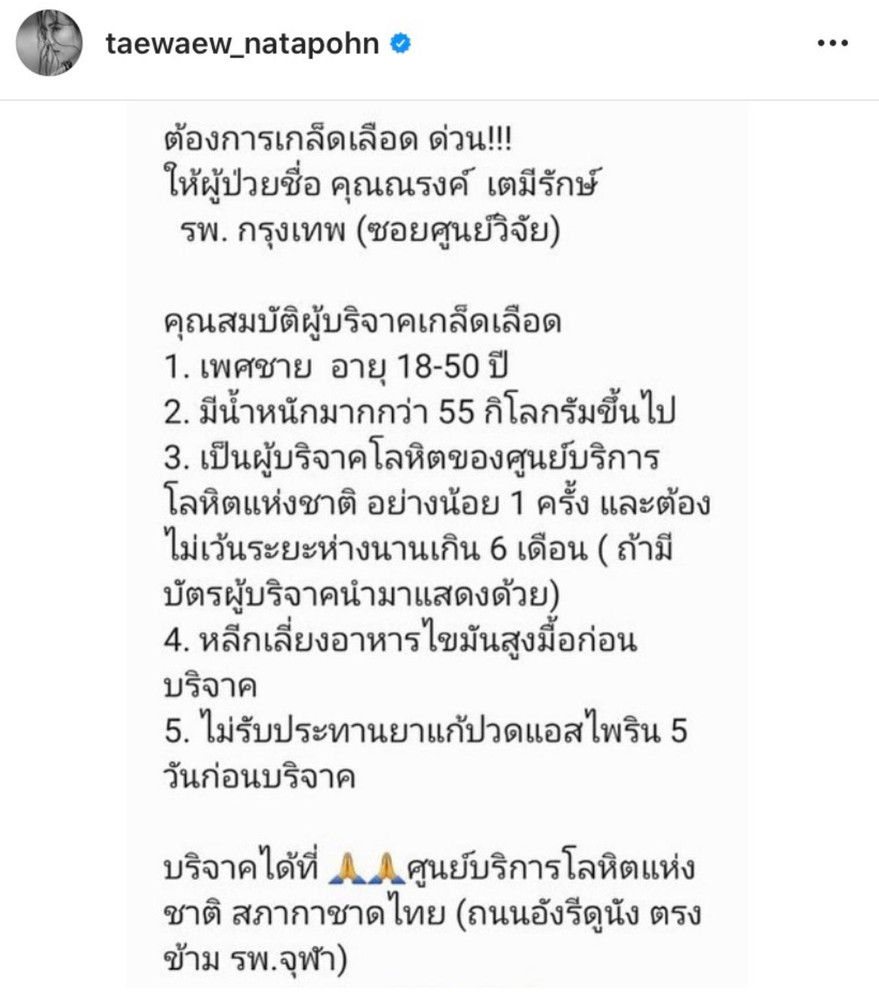 ล่าสุด นางเอกสาว แต้ว ณฐพร ได้โพสต์ข้อความขอความช่วยเหลือจากชาวโซเชียล โดยมีข้อความดังนี้ “ต้องการเกล็ดเลือด ด่วน!!! ให้คุณพ่อแต้ว พลอากาศตรีณรงค์ เตมีรักษ์ คนไข้ของ รพ.กรุงเทพ (ซอยศูนย์วิจัย)
