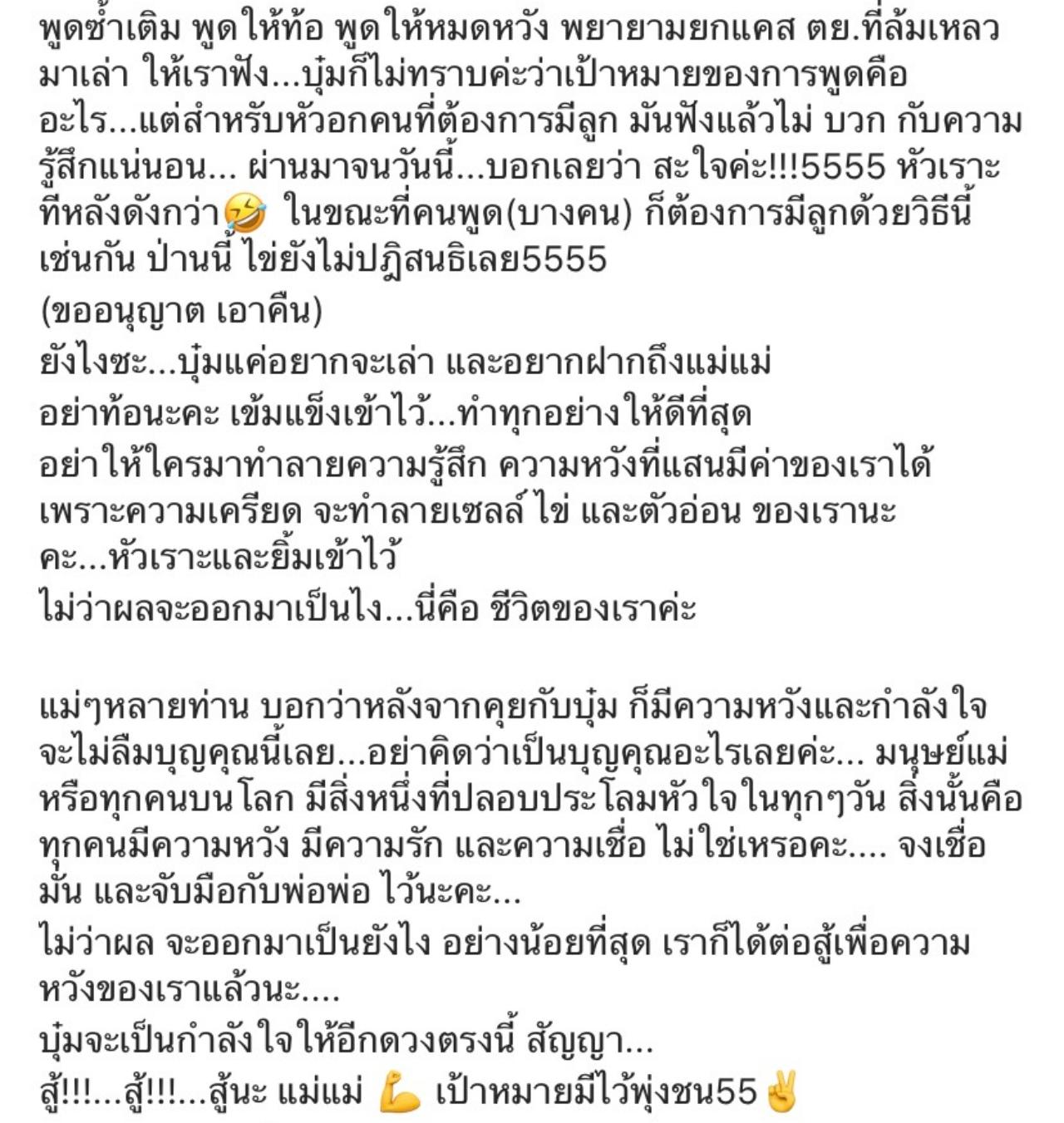 ยังไงซะ...บุ๋มแค่อยากจะเล่า และอยากฝากถึงแม่ๆ อย่าท้อนะคะ เข้มแข็งเข้าไว้...ทำทุกอย่างให้ดีที่สุด อย่าให้ใครมาทำลายความรู้สึก ความหวังที่แสนมีค่าของเราได้ เพราะความเครียด จะทำลายเซลล์ไข่ และตัวอ่อน ของเรานะคะ...หัวเราะและยิ้มเข้าไว้ ไม่ว่าผลจะออกมาเป็นไง...นี่คือ ชีวิตของเราค่ะ