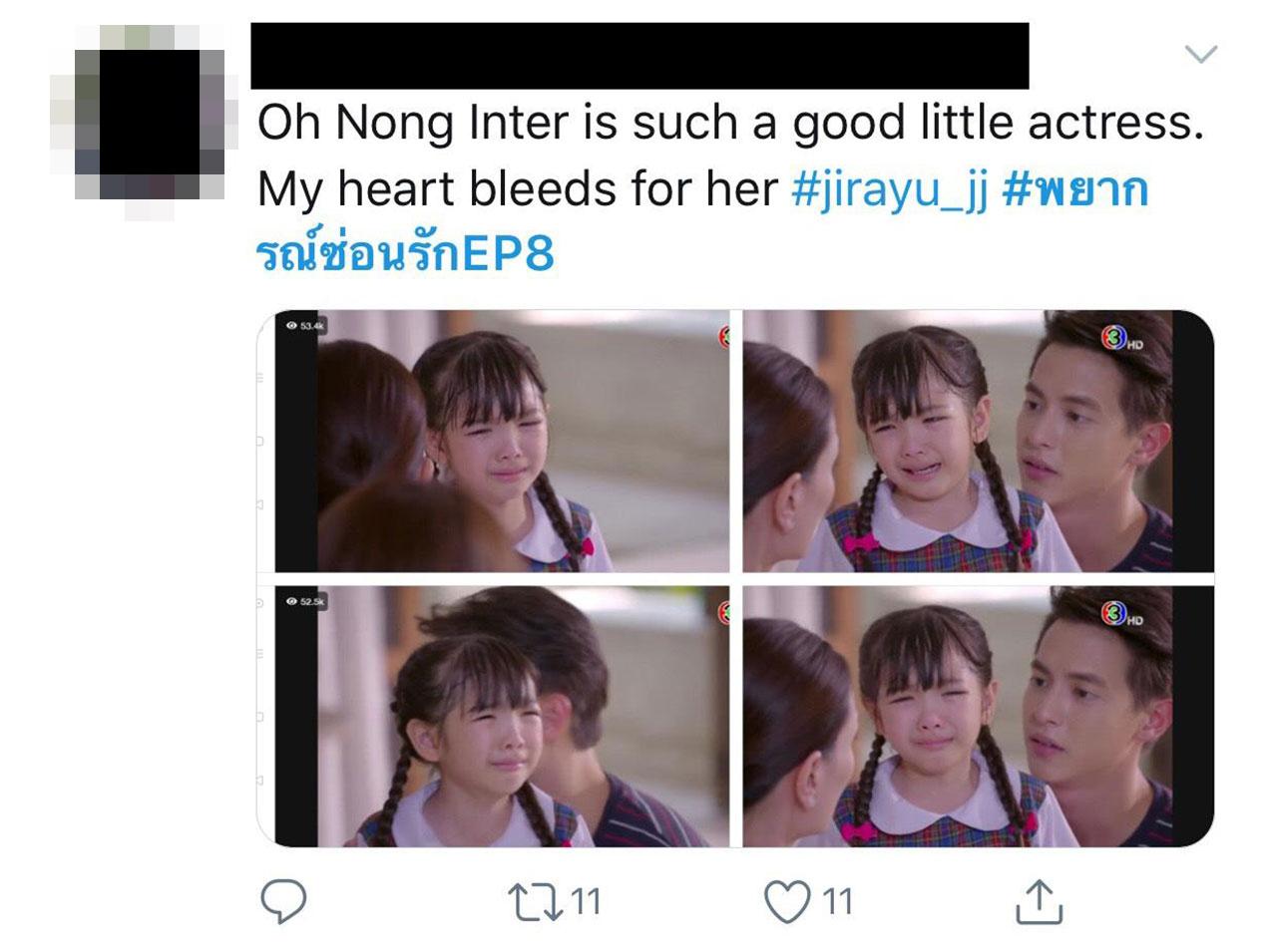 ซึ่งเป็นฉาก ที่ “ธีรวี” เดินเอาสมุดภาพวาด ที่ตั้งใจวาด เพื่อให้ “ธีรัญญ์” (เบนซ์-กมลชนก รอดเสถียร) มีรอยยิ้ม แต่หารู้ไม่ว่า ภาพนั้นกระทบกระเทือนความรู้สึกลึกๆ ของธีรัญญ์อย่างมาก ธีรัญญ์โกรธ ปัดสมุดทิ้งแบบไม่ไยดี แล้วเดินจากไป ปล่อยให้ธีรวีตกใจร้องไห้ทั้งน้ำตา เพราะเข้าใจว่าธีรัญญ์เกลียดตัวเอง ฉากนี้สำหรับเด็กตัวน้อยๆ ต้องบอกว่าไม่ง่ายเลย ในเรื่องของการเปลี่ยนโหมดอารมณ์จากน่ารัก สดใส เป็นดราม่าน้ำตานอง แต่น้องอินเตอร์ ก็โชว์ความเฉียบขาดฉากนี้ได้ถึงอารมณ์ ทำเอาแฟนละครสงสาร แห่ชื่นชมในความสามารถ นี่แหละ จิ๋วแต่แจ๋วของจริง ว่าแต่...ต่อมน้ำตาทำงานได้ดีเหลือเกิน...ลูกเอ๊ย ทั้งเอ็นดู ทั้งสงสาร