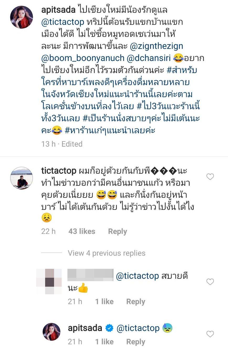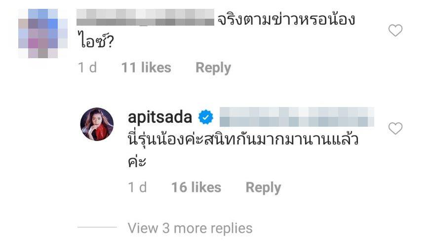 และหลังจากนั้นก็มีชาวเน็ตรายหนึ่งเข้ามาคอมเมนต์ถามตรงๆ ถึงเรื่องข่าวว่า “จริงตามข่าวเหรอน้องไอซ์?” ก่อนที่ ไอซ์ อภิษฎา จะตอบกลับว่า “นี่รุ่นน้องค่ะ สนิทกันมากมานานแล้วค่ะ” ด้านหนุ่มในภาพก็ได้คอมเมนต์เพื่อเคลียร์ประเด็นร้อนแทนรุ่นพี่อย่างสาวไอซ์ว่า “ผมก็อยู่ด้วยกันกับพี่นะ ทำไมข่าวบอกว่ามีคนอื่นมาชนแก้ว หรือมาคุยด้วยเนี่ยยย และก็นั่งกันอยู่หน้าบาร์ ไม่ได้เต้นกันด้วย ไม่รู้ว่าข่าวไปงั้นได้ไง” และ ไอซ์ ก็ตอบกลับเป็นอีโมจิเหงื่อตกหน้าเครียดด้วย.