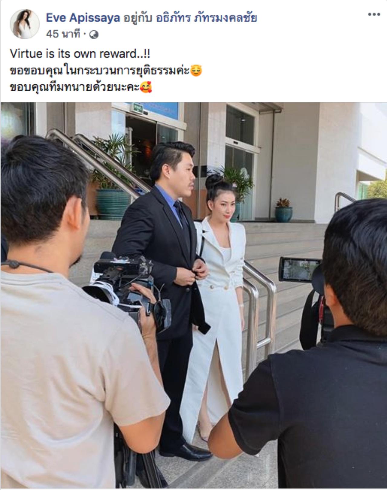 ล่าสุด อีฟ แม็กซิม ก็ได้โพสต์รูปพร้อมข้อความผ่านทางโซเชียล ขอบคุณกระบวนการความยุติธรรมที่มีให้กับเธอ "Virtue is its own reward..!! ขอขอบคุณในกระบวนการยุติธรรมค่ะ ขอบคุณทีมทนายด้วยนะคะ" ซึ่งหลายคนที่ติดตาม ต่างก็เข้าเข้ามาแสดงความยินดี และบอกให้เธอสู้ๆ.