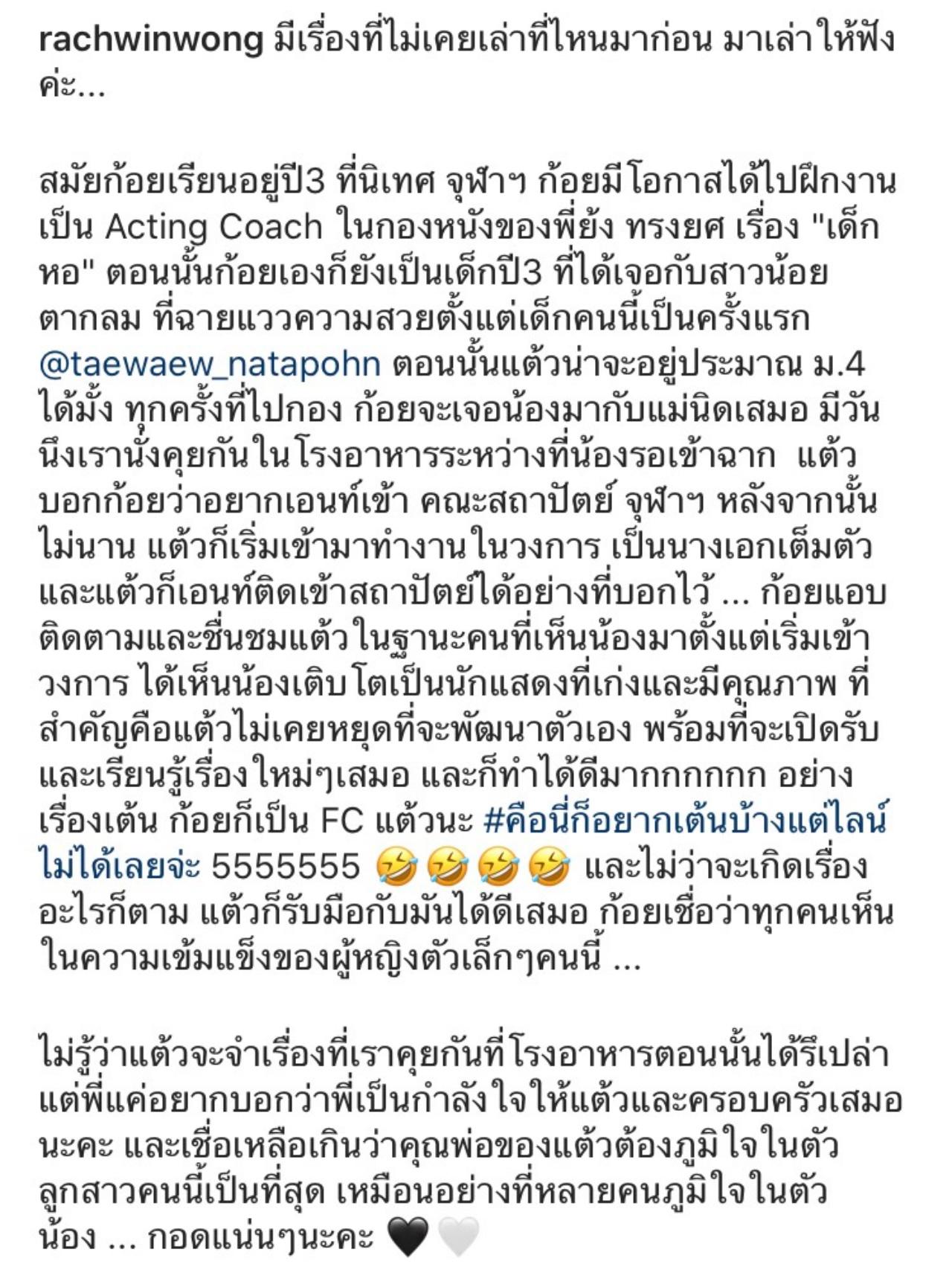 ก้อย รัชวิน เขียนเล่าความประทับใจที่มีต่อ แต้ว ณฐพร เมื่อครั้งยังเป็นเด็ก ม.4 ที่เพิ่งเข้าวงการใหม่ๆ ซึ่ง แต้ว เคยมีความฝันว่า อยากเข้าคณะสถาปัตย์ จุฬาฯ และก็ทำสำเร็จ ซึ่ง ก้อย ยังบอกอีกว่า ตนเองนั้นก็เป็นแฟนคลับของ แต้ว ในเรื่องเต้นเหมือนกัน