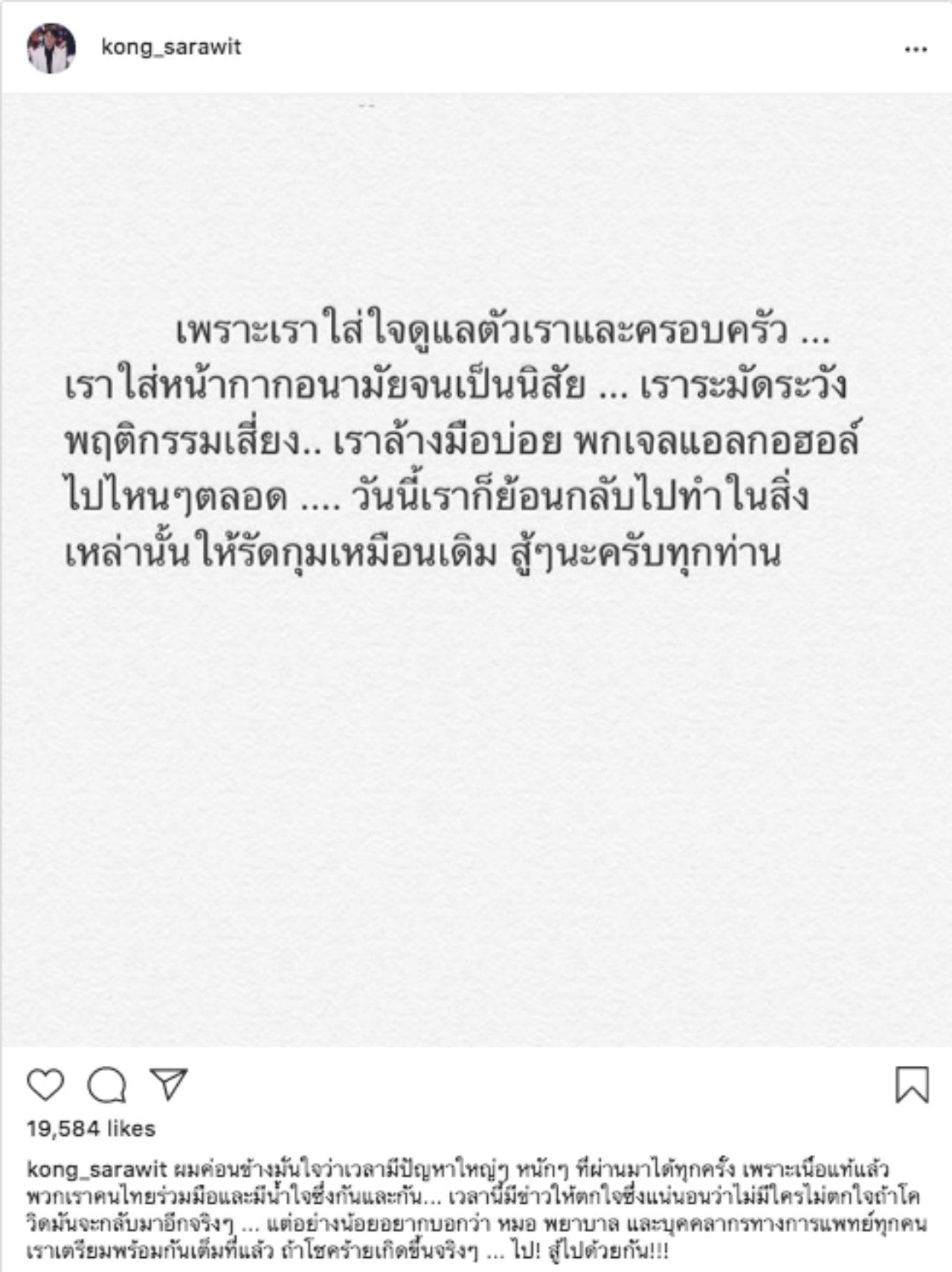 โดย หมอก้อง โพสต์รูปที่มีข้อความว่า "เพราะเราใส่ใจดูแลตัวเราและครอบครัว...เราใส่หน้ากากอนามัยจนเป็นนิสัย...เราระมัดระวังพฤติกรรมเสี่ยง...เราล้างมือบ่อย พกเจลแอลกอฮอล์ไปไหนๆ ตลอด....วันนี้เราก็ย้อนกลับไปทำในสิ่งเหล่านั้นให้รัดกุมเหมือนเดิม สู้ๆ นะครับทุกท่าน"