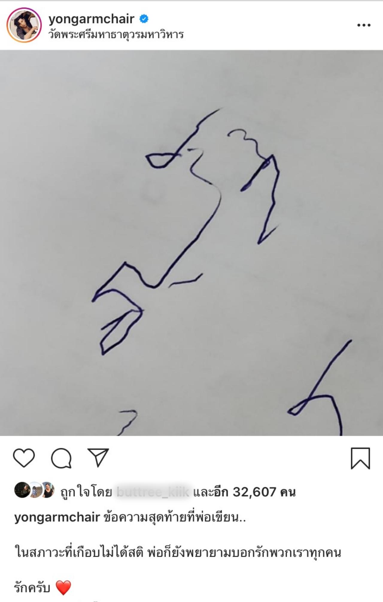 ล่าสุด โย่ง อาร์มแชร์ ได้เผยข้อความสุดท้ายที่คุณพ่อได้พยายามบอกกับคนในครอบครัว ซึ่งหนุ่มโย่งได้โพสต์ผ่านอินสตาแกรมของตัวเอง ซึ่งคุณพ่อได้เขียนคำว่า “รัก” และหนุ่มโย่งเขียนแคปชั่นว่า “ข้อความสุดท้ายที่พ่อเขียน.. ในสภาวะที่เกือบไม่ได้สติ พ่อก็ยังพยายามบอกรักพวกเราทุกคน รักครับ”