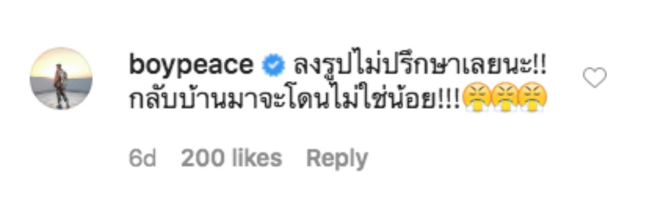แต่งานนี้ บอย พีซเมคเกอร์ ถึงกับอดรนทนไม่ไหวถึงกับเข้ามาคอมเมนต์ดุว่า "ลงรูปไม่ปรึกษาเลยนะ!! กลับบ้านมาจะโดนไม่ใช่น้อย"