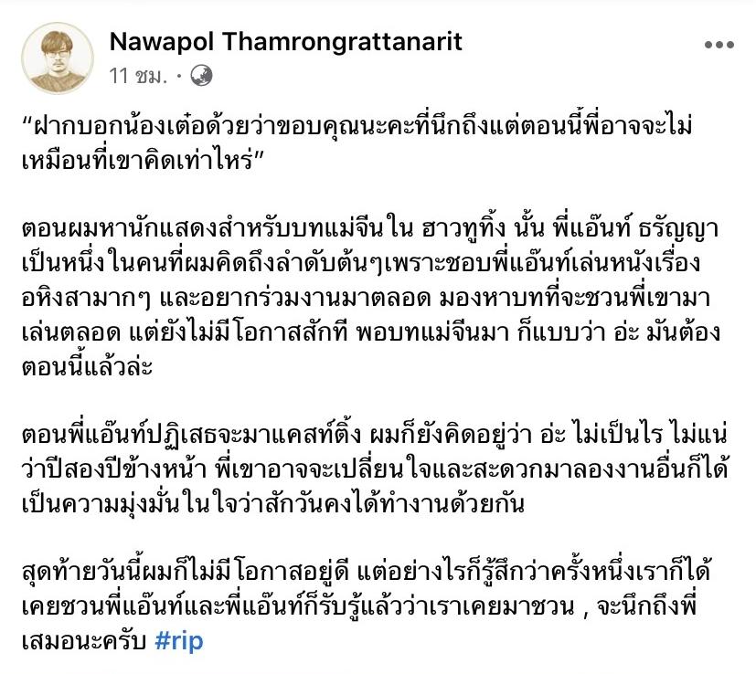 ตอนพี่แอ๊นท์ปฏิเสธจะมาแคสท์ติ้ง ผมก็ยังคิดอยู่ว่า อ่ะ ไม่เป็นไร ไม่แน่ว่าปีสองปีข้างหน้า พี่เขาอาจจะเปลี่ยนใจและสะดวกมาลองงานอื่นก็ได้ เป็นความมุ่งมั่นในใจว่าสักวันคงได้ทำงานด้วยกัน สุดท้ายวันนี้ผมก็ไม่มีโอกาสอยู่ดี แต่อย่างไรก็รู้สึกว่าครั้งหนึ่งเราก็ได้เคยชวนพี่แอ๊นท์และพี่แอ๊นท์ก็รับรู้แล้วว่าเราเคยมาชวน, จะนึกถึงพี่เสมอนะครับ #rip”.