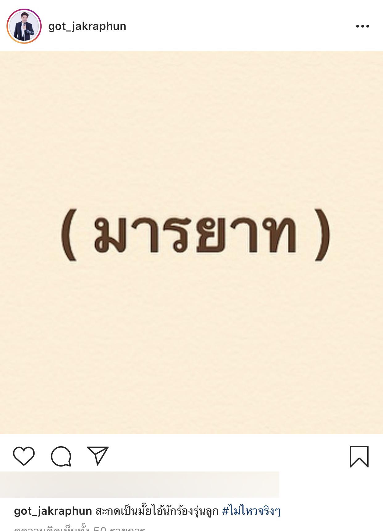 กลายเป็นปมดราม่าร้อน เมื่อนักร้องซุปเปอร์สตาร์ลูกทุ่ง ก๊อท จักรพันธ์ ครบุรีธีรโชติ โพสต์ภาพข้อความตัวใหญ่ว่า “(มารยาท)” และเขียนแคปชั่นสุดแซ่บ “สะกดเป็นมั้ยไอ้นักร้องรุ่นลูก #ไม่ไหวจริงๆ” ก่อนที่หลายคนจะเข้ามาให้กำลังใจและบอกให้ใจเย็นๆ ก่อนจะลบโพสต์ดังกล่าวออกไป