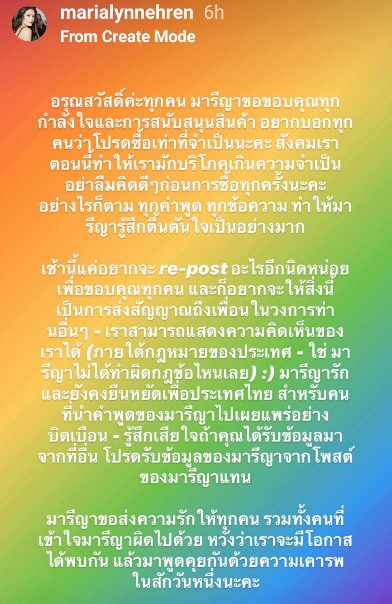 "เช้านี้แค่อยากจะ re-post อะไรอีกนิดหน่อย เพื่อขอบคุณทุกคน และก็อยากจะให้สิ่งนี้เป็นการส่งสัญญาณ ถึงเพื่อนในวงการท่านอื่นๆ เราสามารถแสดงความคิดเห็นของเราได้ ภายใต้กฎหมายของประเทศ ใช่ มารีญาไม่ได้ทำผิดกฎข้อไหนเลย มารีญารักและยังคงยืนหยัดเพื่อประเทศไทย