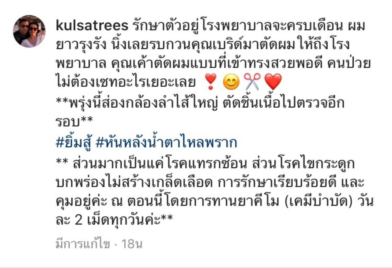 ล่าสุด นิ้ง ก็ได้เผยภาพผมทรงใหม่ที่ตัดสั้นเรียบร้อยแบบไม่ต้องเซตทรง พร้อมกับอัปเดตอาการป่วย โดยบอกว่า ต้องส่องกล้องลำไส้ใหญ่ เพื่อตัดชิ้นเนื้อไปตรวจอีกรอบ แม้จะยิ้มสู้ แต่พอหันหลังไปก็น้ำตาไหลพราก