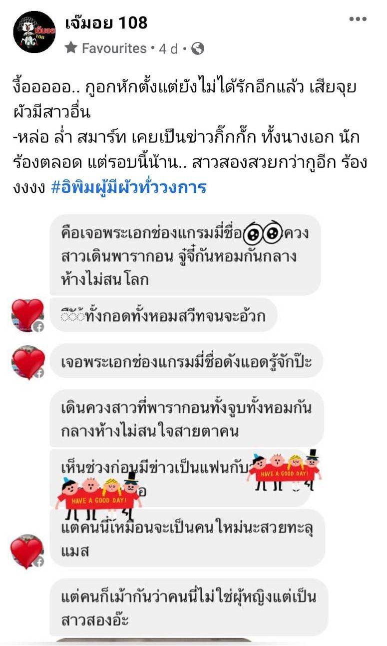 กลายเป็นประเด็นร้อน เมื่อเพจบันเทิงดัง เจ๊มอย 108 เม้าท์ข่าวพระเอกช่องแกรมมี่ควงสาวประเภทสองเดินห้าง จู๋จี๋หอมกันกลางห้างไม่สนโลก แถมยังโพสต์ภาพแอบถ่ายของนักแสดงหนุ่มค่ายแกรมมี่ เมฆ จิรกิตติ์ ถาวรวงศ์ และนางแบบสาวประเภทสอง เฟรม วรณัน นลัทวรสกุล ทำให้เป็นที่วิพากษ์วิจารณ์ และหลายคนสงสัยว่าสรุปแล้วเรื่องเป็นยังไงกันแน่