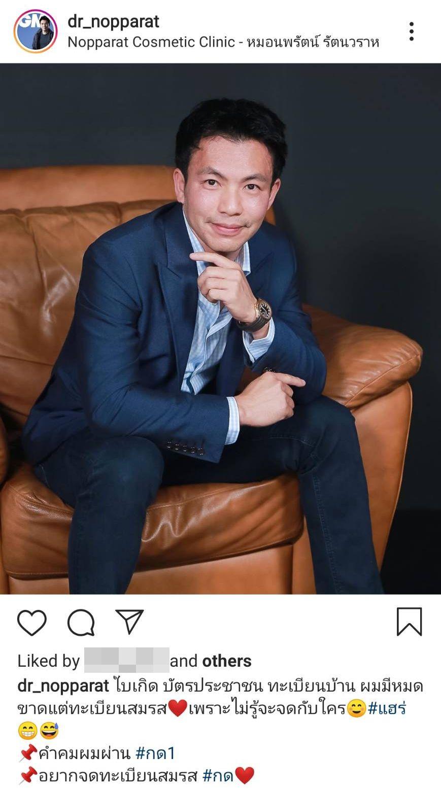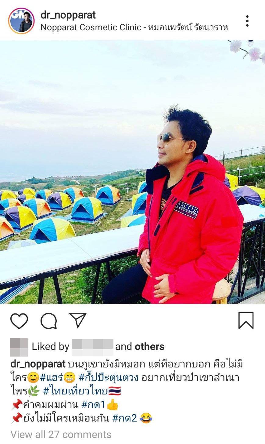 โดย หมอสอง โพสต์ภาพตัวเองขณะที่ไปเที่ยวภูเขา และกางเต็นท์ตั้งแคมป์ พร้อมทั้งเขียนแคปชั่น “บนภูเขายังมีหมอก แต่ที่อยากบอก คือไม่มีใคร #แฮร่ #กั๊ปป๊ะตุ่นตวง อยากเที่ยวป่าเขาลำเนาไพร #ไทยเที่ยวไทย คำคมผมผ่าน #กด1 ยังไม่มีใครเหมือนกัน #กด2” ทำเอาหลายคนเข้ามาคอมเมนต์เลือกกันยกใหญ่ แต่ก็มีบางคนที่คอมเมนต์ว่านึกว่ามีแฟนแล้ว